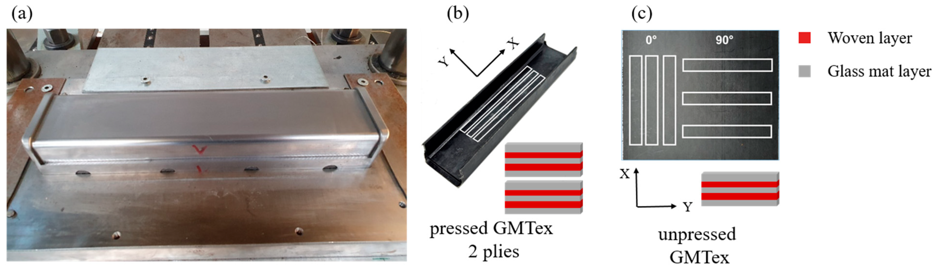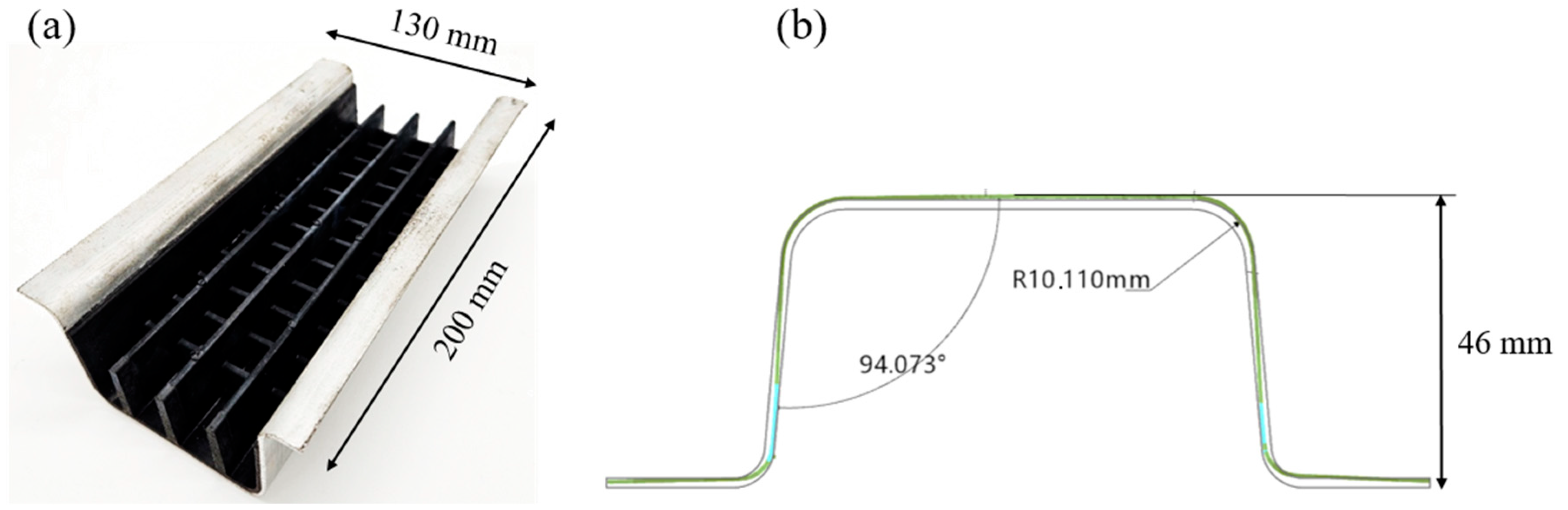 - Jayakumar, S.; Anand, S.; Fang, X. Design Optimization and Validation of GMT Hat Structures. In Proceedings of the 14th International Conference on the Technology of Plasticity—Current Trends in the Technology of Plasticity, Mandelieu-La Napoule, France, 24–29 September 2023; Mocellin, K., Bouchard, P.-O., Bigot, R., Balan, T., Eds.; Springer Nature Switzerland: Cham, Switzerland, 2024; pp. 768–776. [Google Scholar] [CrossRef]