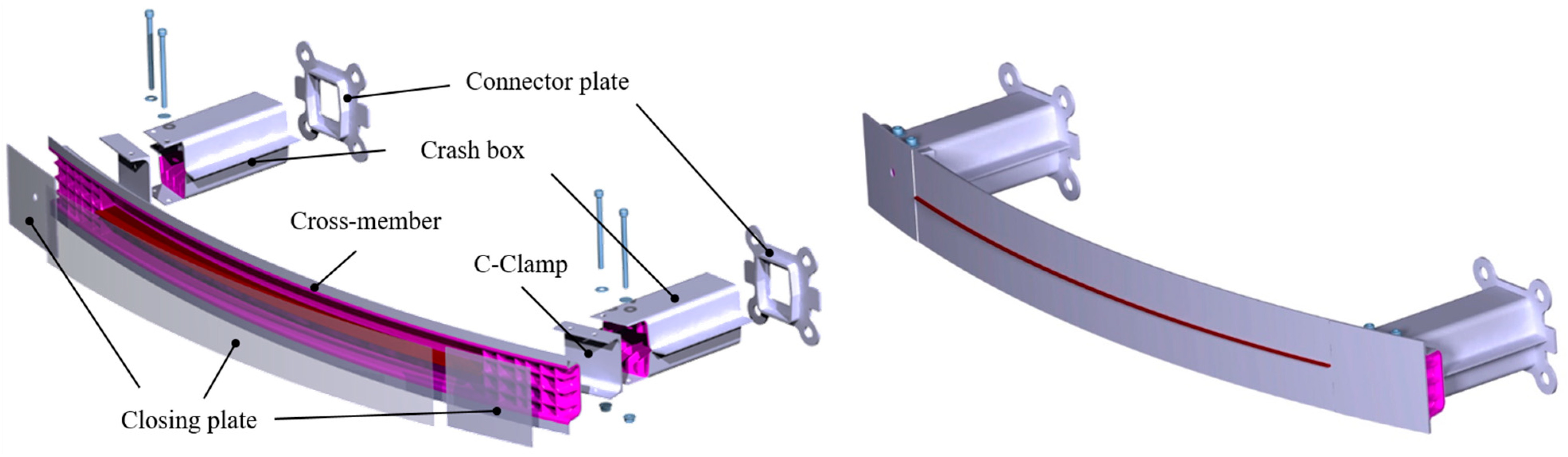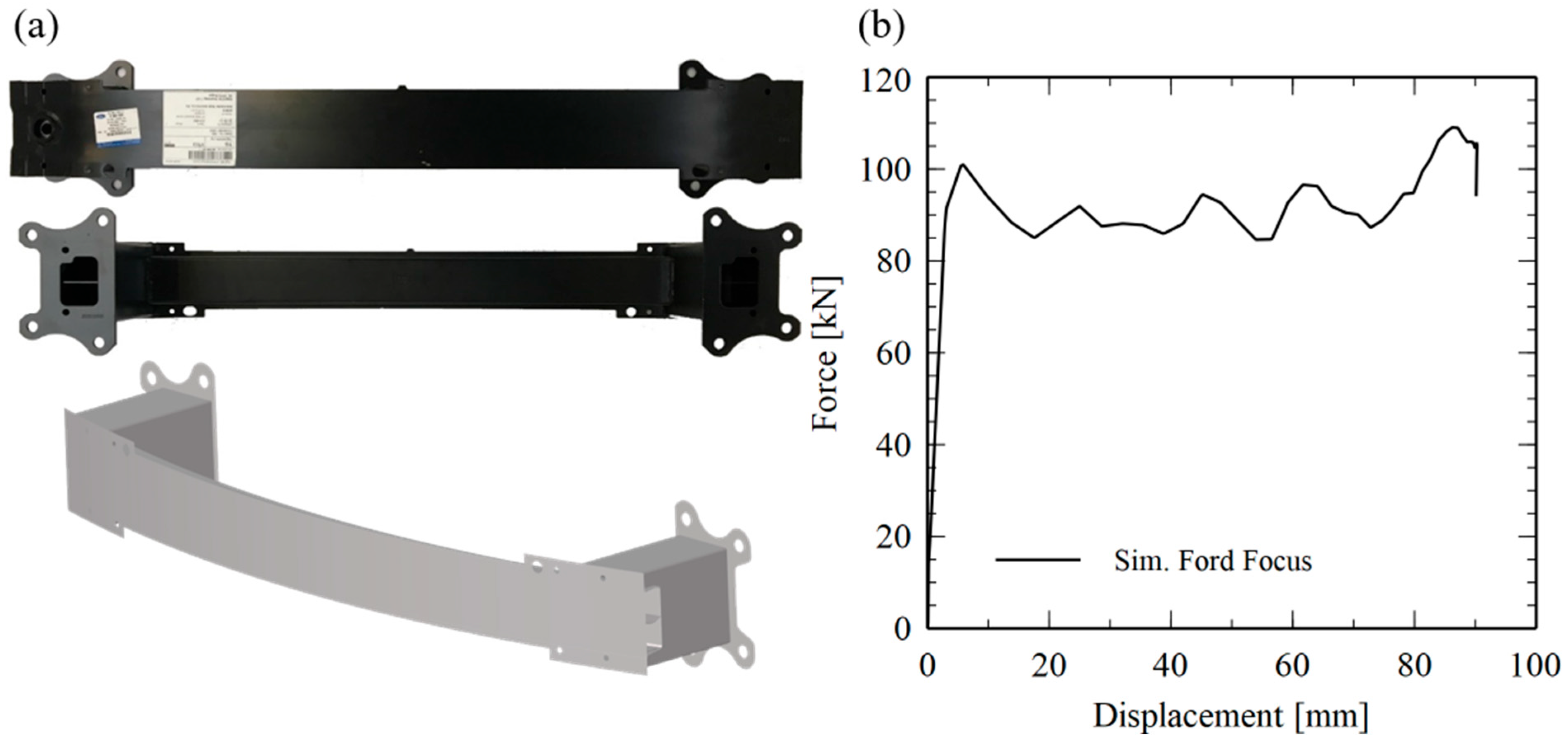 - Belingardi, G.; Beyene, A.T.; Koricho, E.G.; Martorana, B. Alternative lightweight materials and component manufacturing technologies for vehicle frontal bumper beam. Compos. Struct. 2015, 120, 483–495. [Google Scholar] [CrossRef]