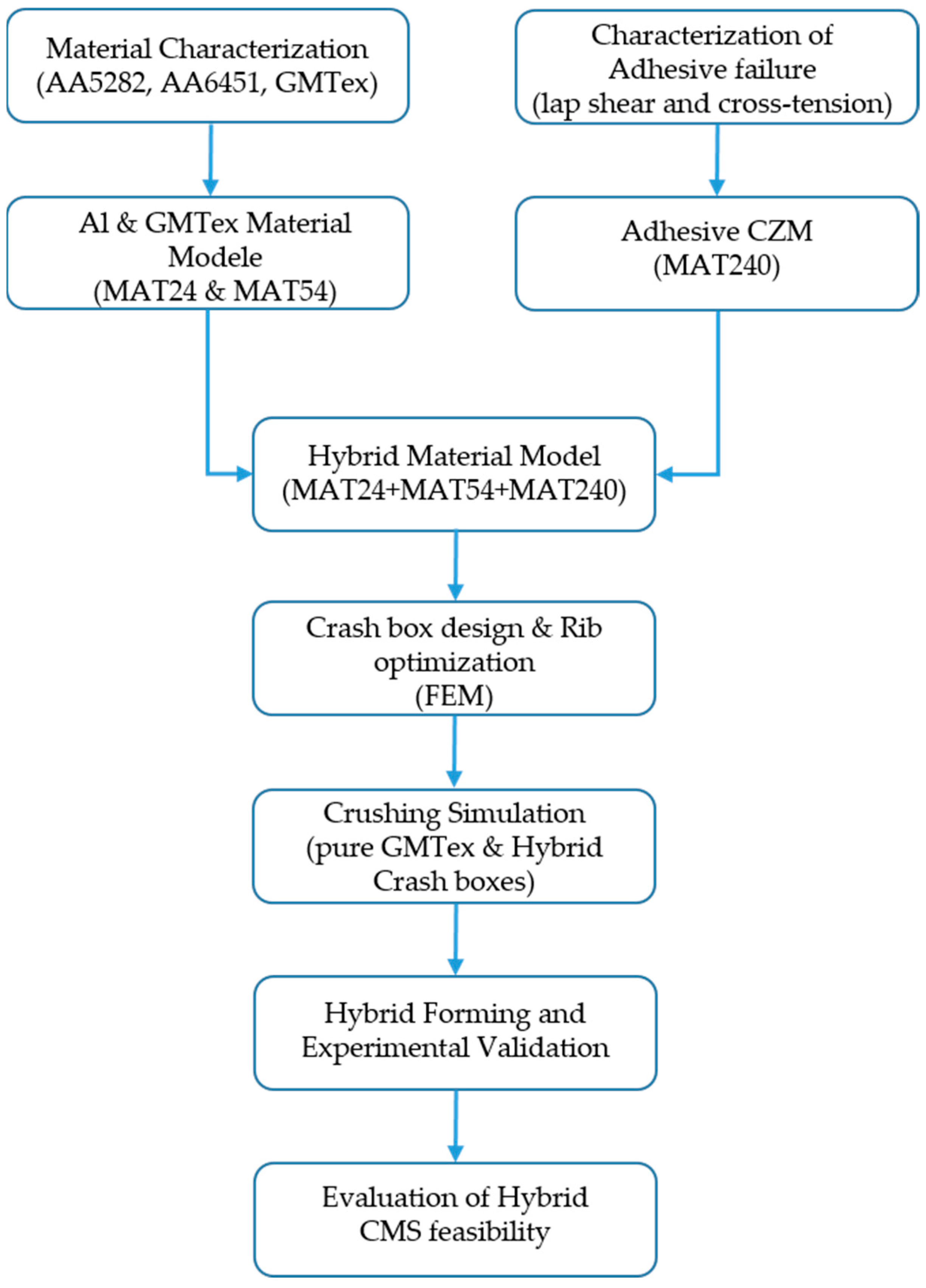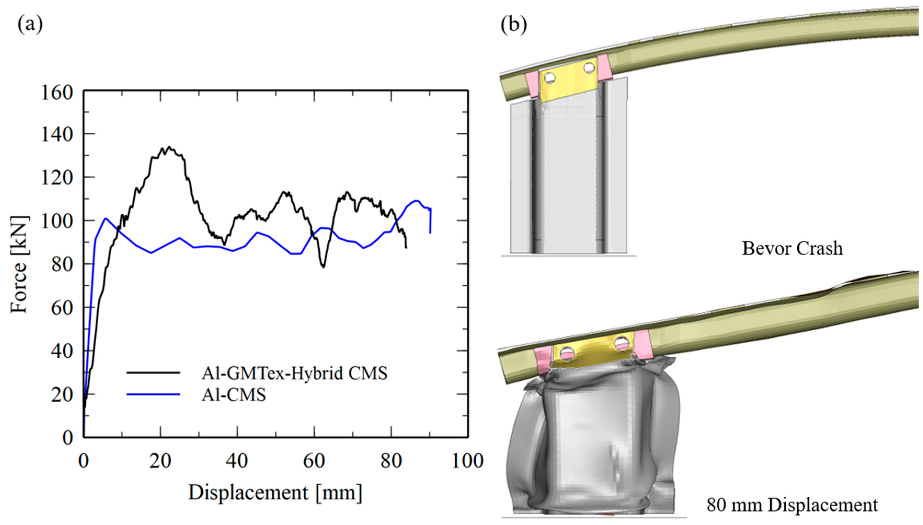 - The orthogonal rib configuration (CB3) demonstrated the most favorable balance of high specific energy absorption (SEA) and homogeneous force–displacement behavior. The pure GMTex crash box with this kind of optimized structure shows an SEA value of 31.4 kJ/kg, compared to ca. 20 kJ/kg for pure aluminum. The Al–GMTex hybrid has a SAE of 32.5 kJ/kg, which is only 3% higher than pure GMTex. However, it prevents any splits of the GMTex materials from escaping the Al profile.