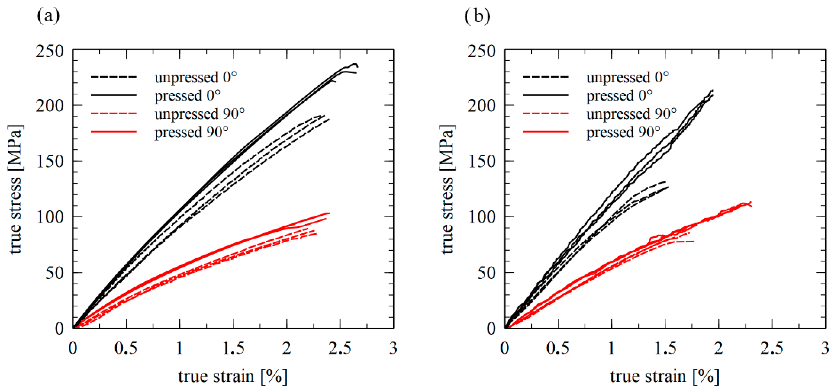 - The mechanical properties of GMTex material are significantly influenced by the number of stacked plies and the woven fabric’s orientation. GMTex pressed in two plies shows higher tensile and compressive strengths of 240 MPa and 210 MPa, respectively, compared to 190 MPa and 130 MPa for unpressed GMTex. GMTex in the longitudinal direction of compression molding flow direction exhibits higher tensile and compressive strength compared to the transverse direction.