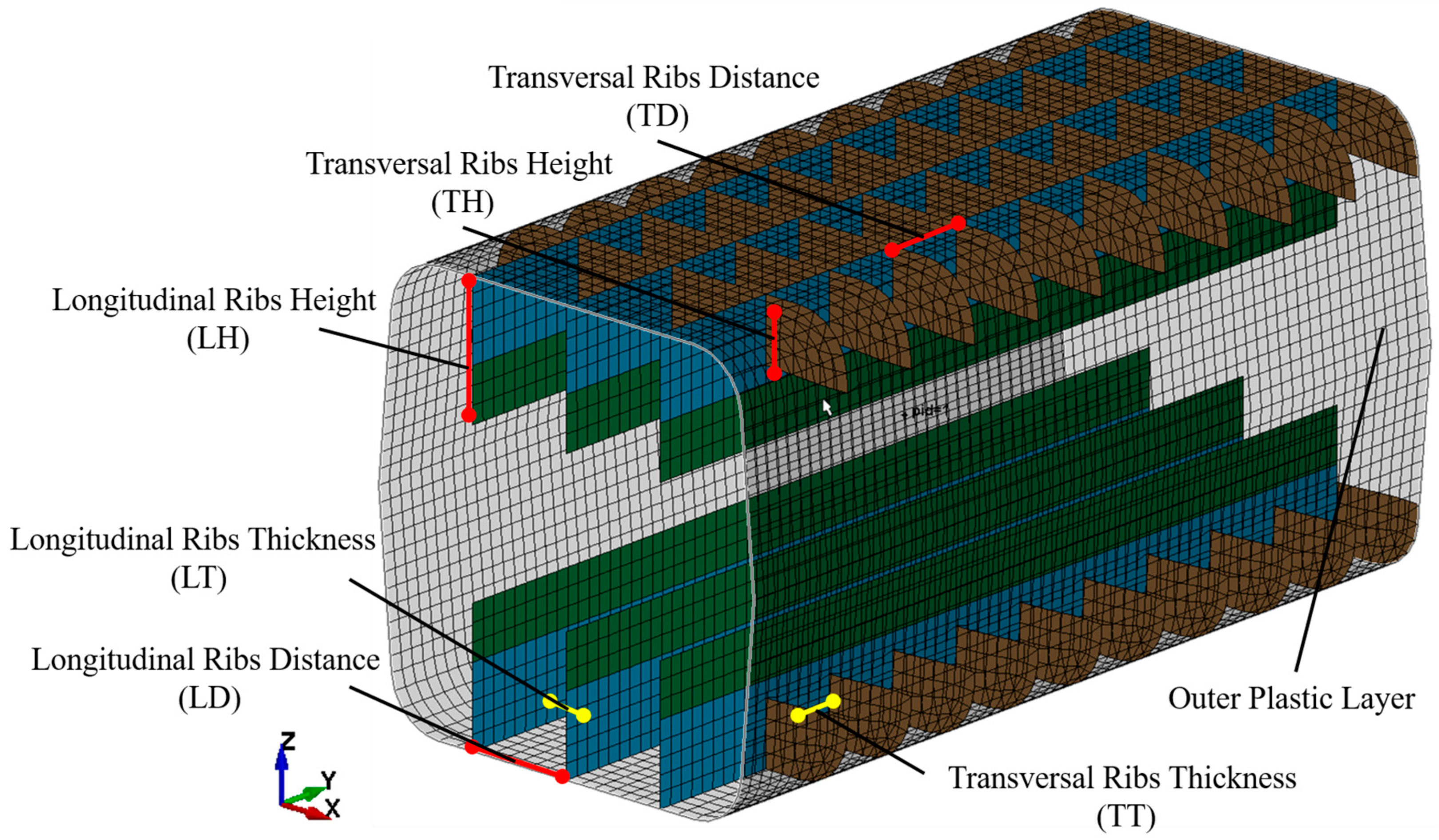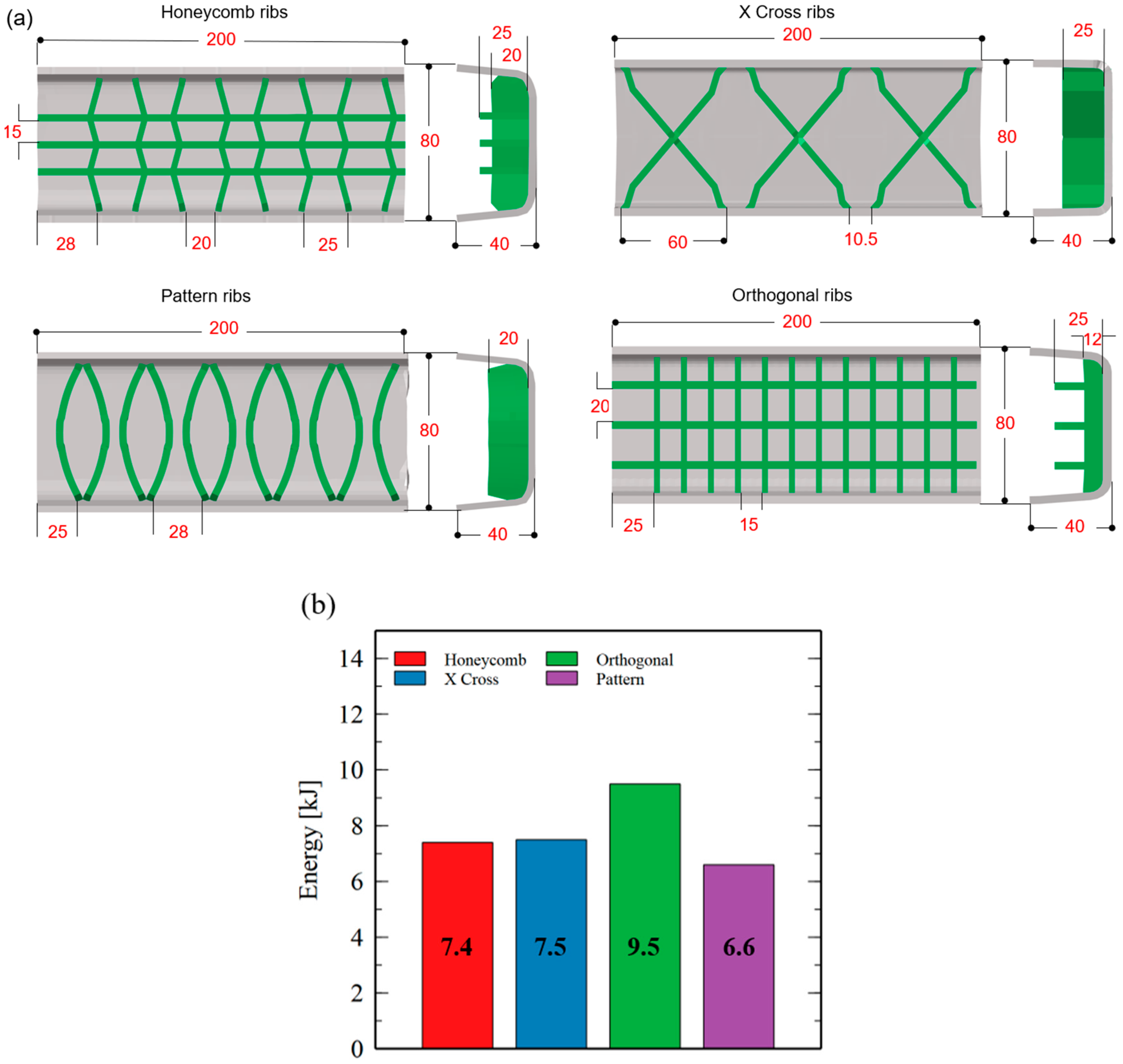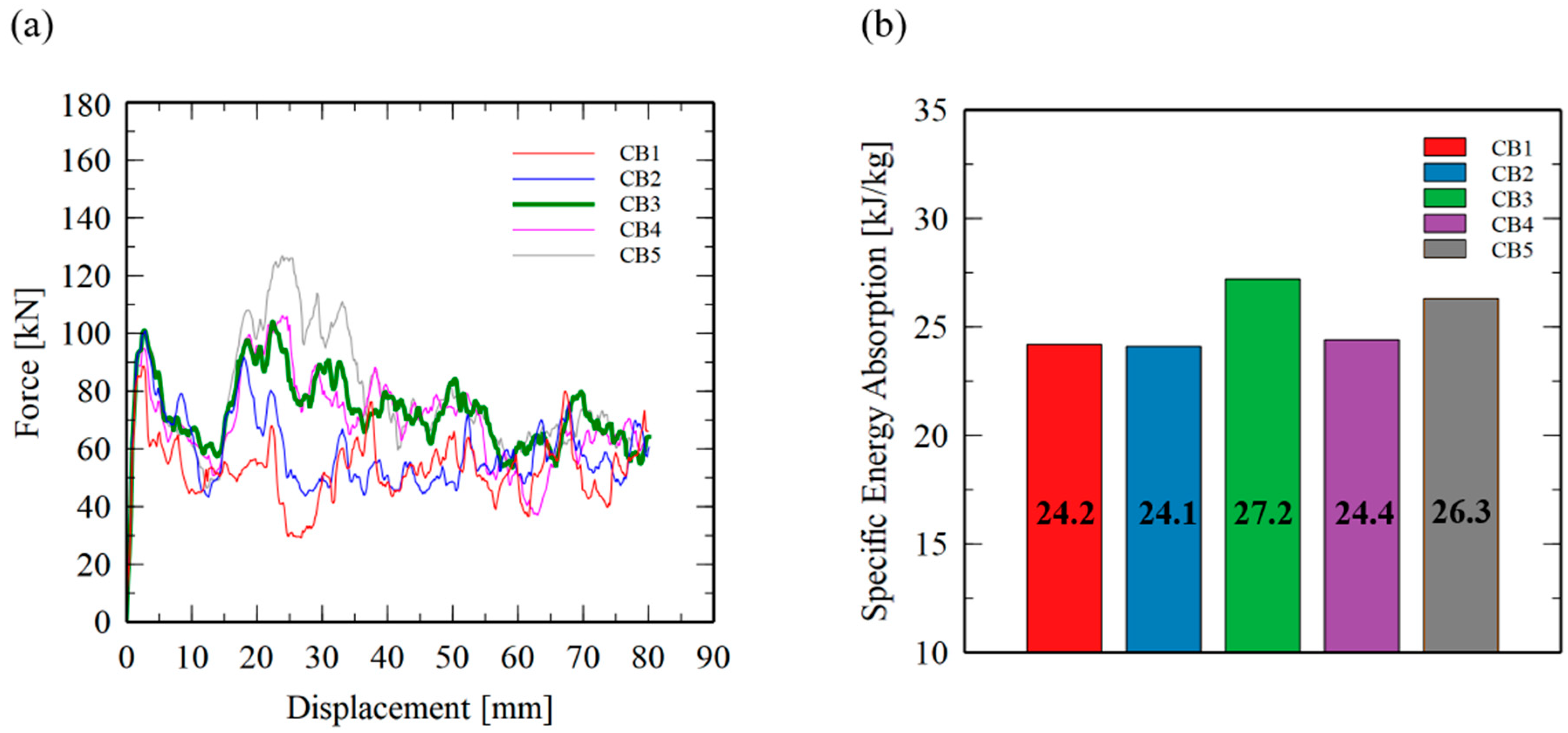 - Rib structure optimization: The orthogonal rib configuration (CB3) demonstrated the most favorable balance of high specific energy absorption (SEA) and homogeneous force–displacement behavior, making it the optimal pure GMTex reference design.