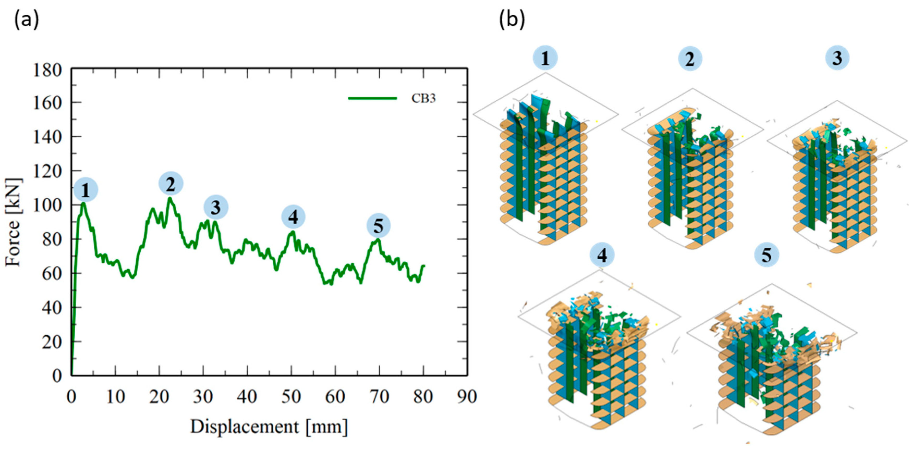- Simulation-Experiment agreement: The finite element simulations reproduced the folding sequence, load levels, and energy absorption characteristics with good consistency, confirming the suitability of the calibrated material and cohesive-zone models.