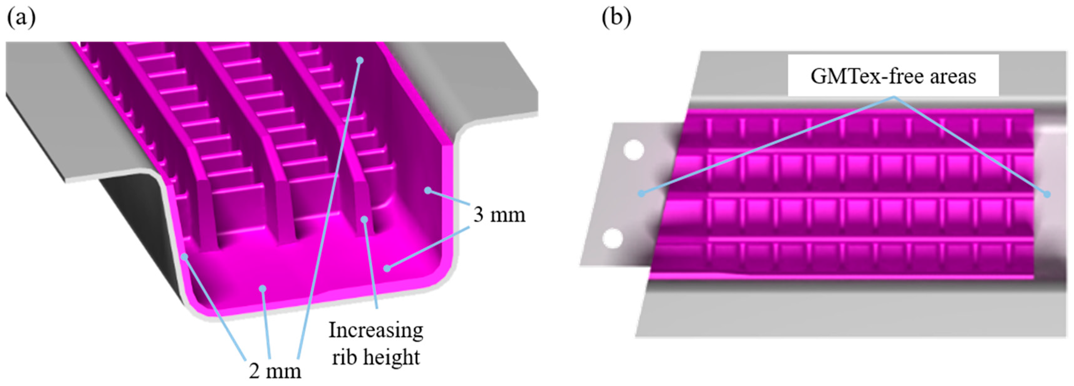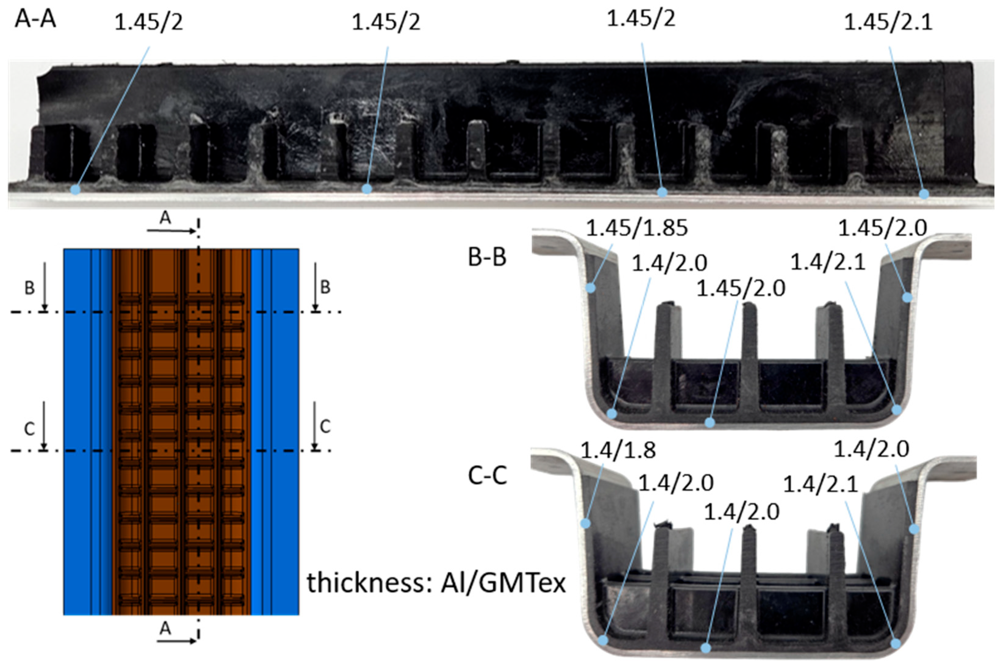 - Using the predeveloped tooling concept, both pure GMTex and an Al–GMT hybrid crash box could be successfully hybrid-formed. The GMTex thickness distribution was homogeneous and thus can be considered satisfactory. However, the fiber filling of GMTex in thin ribs was limited, restricting the design freedom of GMTex.