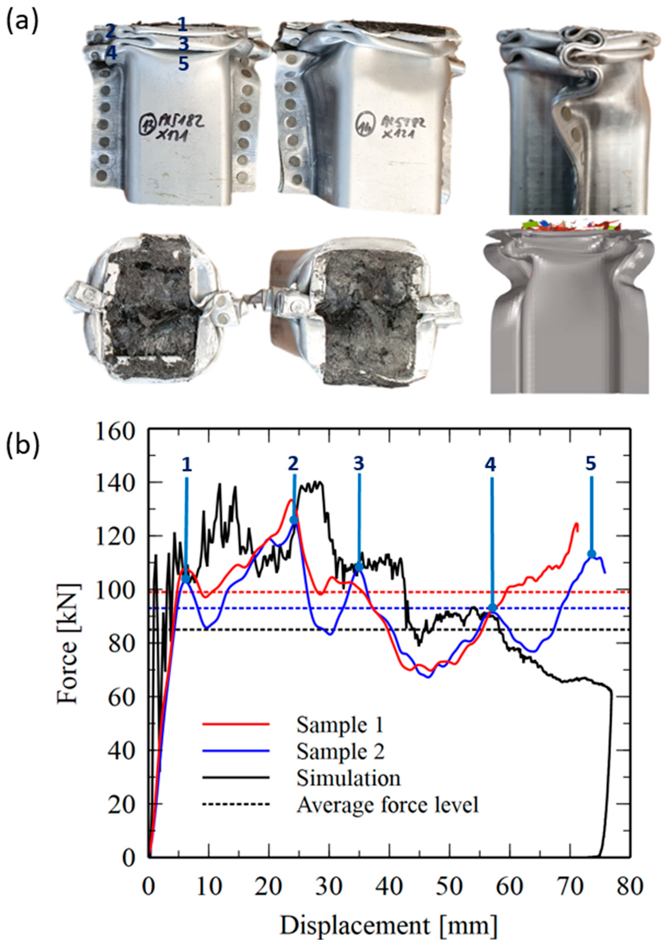 - Reuter, C.; Tröster, T. Crashworthiness and numerical simulation of hybrid aluminium-CFRP tubes under axial impact. Thin-Walled Struct. 2017, 117, 1–9. [Google Scholar] [CrossRef]
