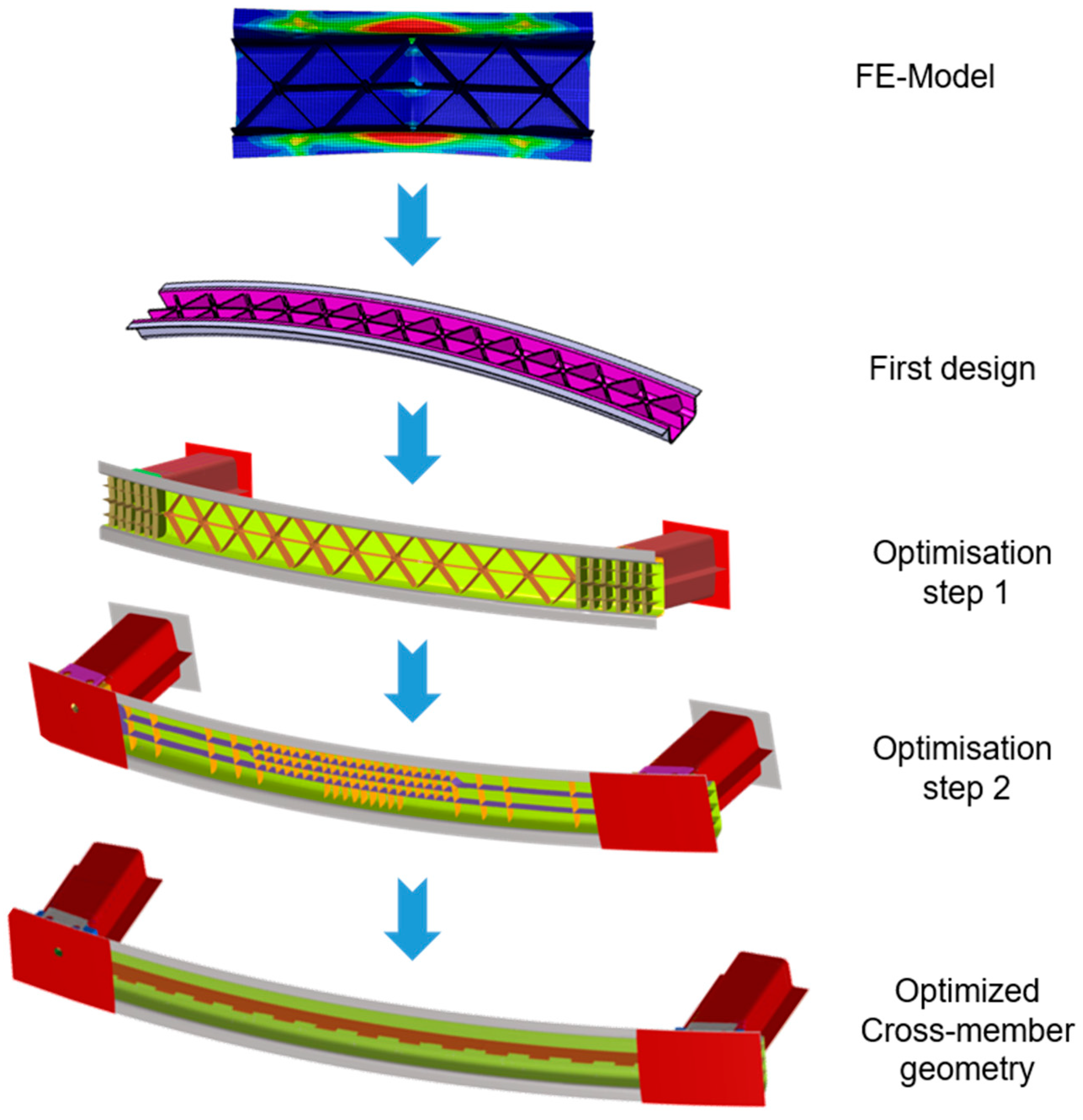 - The hybrid CMS shows approx. 10% less intrusion and 10% higher mean force level. This could be considered additional weight-saving potential that could not be utilized during this work due to the limitations of minimum aluminum and GMTex rib thicknesses.