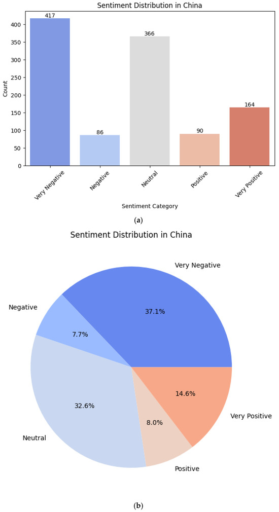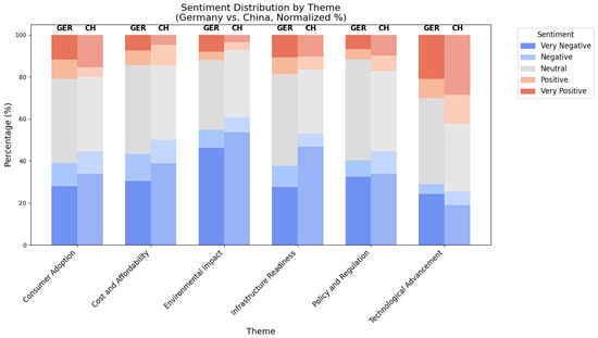 However, since the number of items for the German and Chinese datasets is different, it was hard to visualize the comparison. Therefore, instead of using absolute values, a new plot was created by using a pivot table, calculating the percentage distribution of sentiments within each theme–country pair. This ensured that themes with varying numbers of posts remain comparable, eliminating biases caused by differences in data volume between Germany and China.
