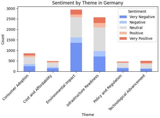 29]. This aligns with the sentiment analysis results of this study, where infrastructure readiness emerged as a dominant theme in German discussions. Public concern about whether the current charging network can support widespread EV adoption, inconsistent charging speeds, and range anxiety play a significant role in shaping consumer sentiment. Additionally, environmental concerns remain an important topic as there is ongoing debate over the true sustainability of EVs. Addressing these concerns through improved charging infrastructure and open communication on the environmental benefits of electrification could positively influence public perception in Germany.