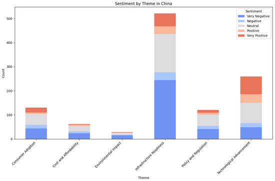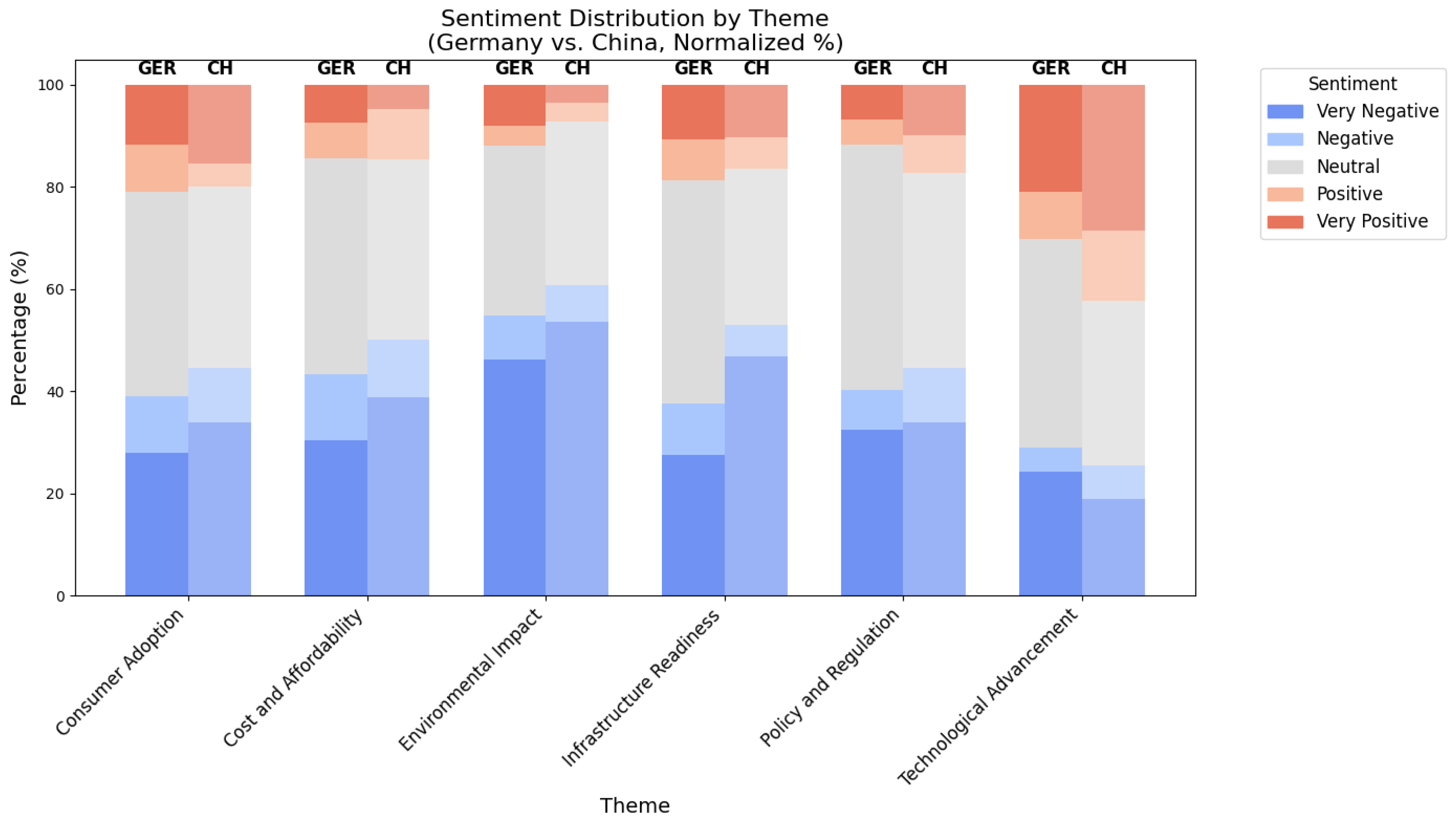 The sentiment distribution of themes in the China dataset presents a different picture compared to Germany. Infrastructure readiness stands out as the most discussed theme, with a significant number of very negative mentions, indicating concerns about the adequacy of charging networks and related infrastructure. However, it also has a notable share of positive sentiment, suggesting a recognition of ongoing improvements. Technological advancement is the most positively perceived theme, with a high proportion of positive and very positive mentions, reflecting strong confidence in China’s progress in electric vehicle technology. Consumer adoption and cost and affordability lean toward neutral and very negative sentiment, implying that while challenges exist, they may not be perceived as major barriers. Similar distribution can be found in the policy and regulation theme, suggesting that while some policies are met with approval, there is also skepticism about their implementation. Environmental impact, in contrast to Germany, is the least contentious theme, with very few mentions overall and relatively negative sentiment distribution, which may indicate lower public concern, though at the same time highlighting the fact that the public does discuss the environmental challenges posed by electric mobility.