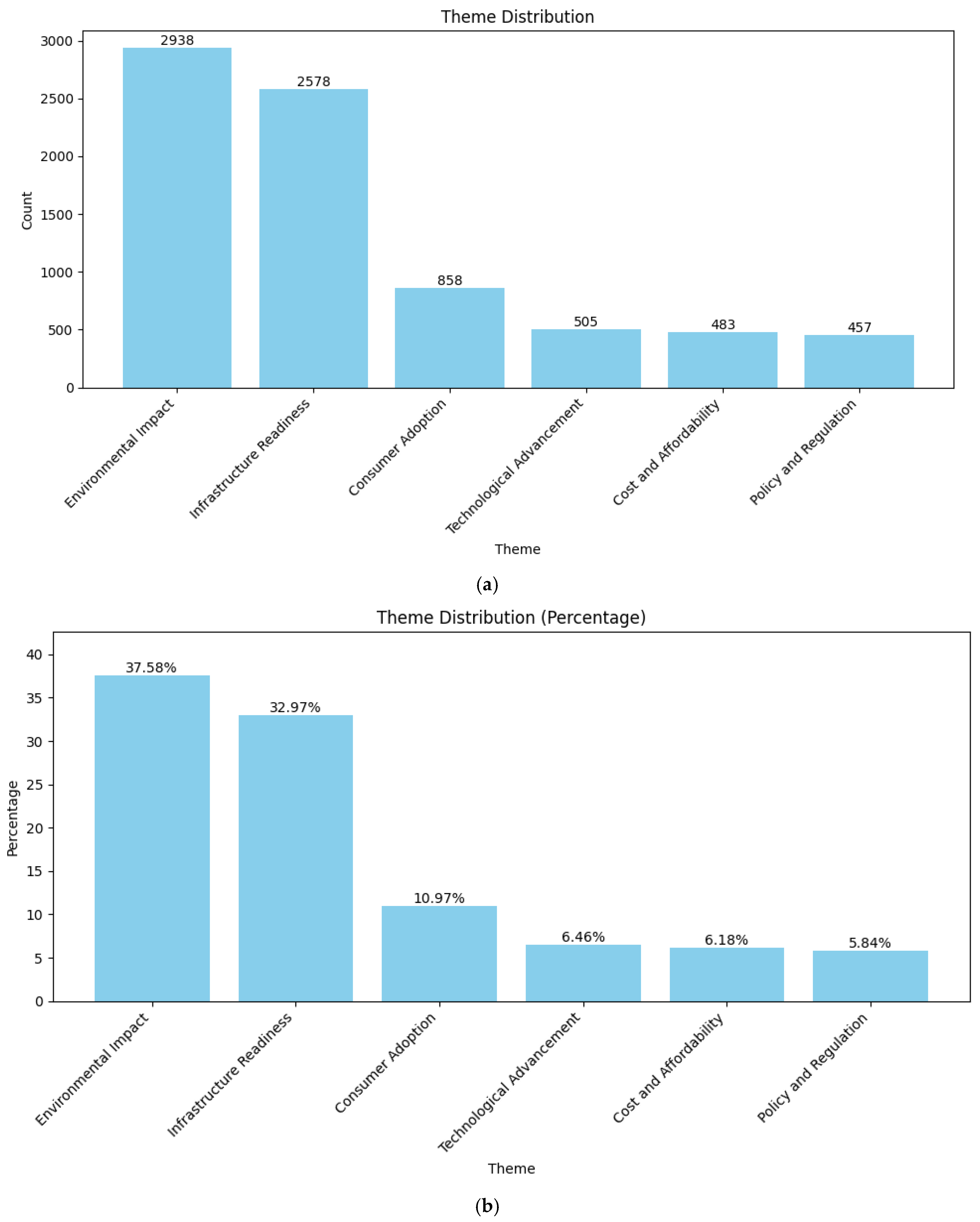 As the results show, in the German dataset, environmental impact (37.58%) and infrastructure readiness (32.97%) are two major themes. The consumer adoption (10.97%) topic follows these themes, and the remaining themes, such as technological advancement (6.46%), cost and affordability (6.18%), and policy and regulation (5.84%), have almost the same relevancy level. This may suggest that e-mobility developments come with environmental concerns and that the main pain point is infrastructure readiness.