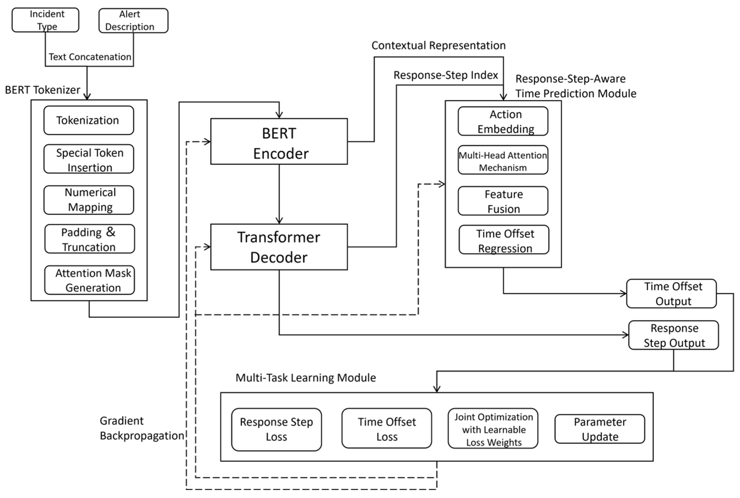 - BERT-based regression model: A pretrained BERT encoder converted the concatenated incident type and alert description into a dense vector representation, followed by a regression layer to estimate incident duration.