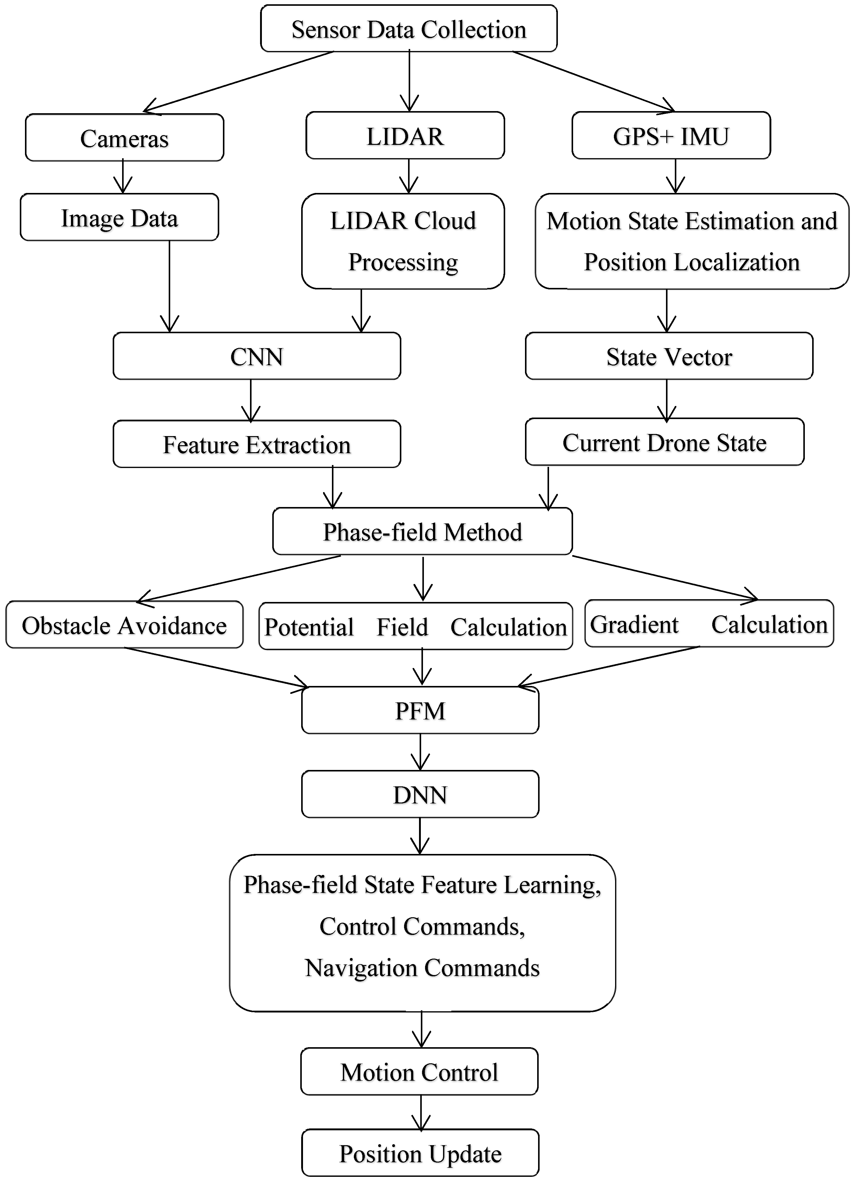 - Proposed PFM-DNN Framework for UAV Navigation: This study proposes an innovative framework that integrates phase-field modeling with deep neural networks (PFM-DNN) to generate continuous-field representations, enabling drones to plan smooth and collision-free trajectories and effectively avoid obstacles, thereby enhancing autonomous navigation in complex urban environments.