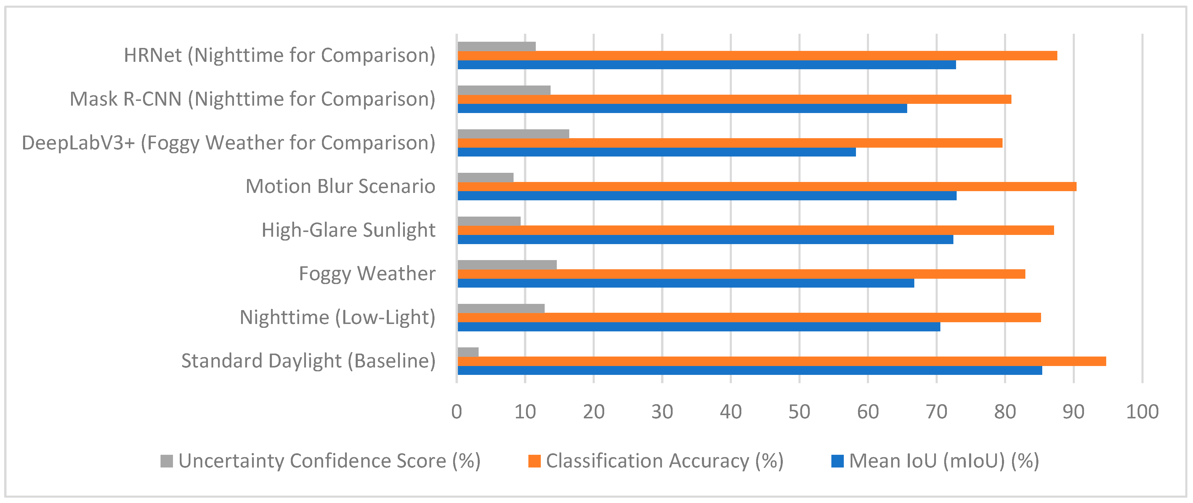 | Environmental Condition | Mean IoU (mIoU) (%) | Classification Accuracy (%) | Uncertainty Confidence Score (%) | False Positive Rate (FPR) (%) |