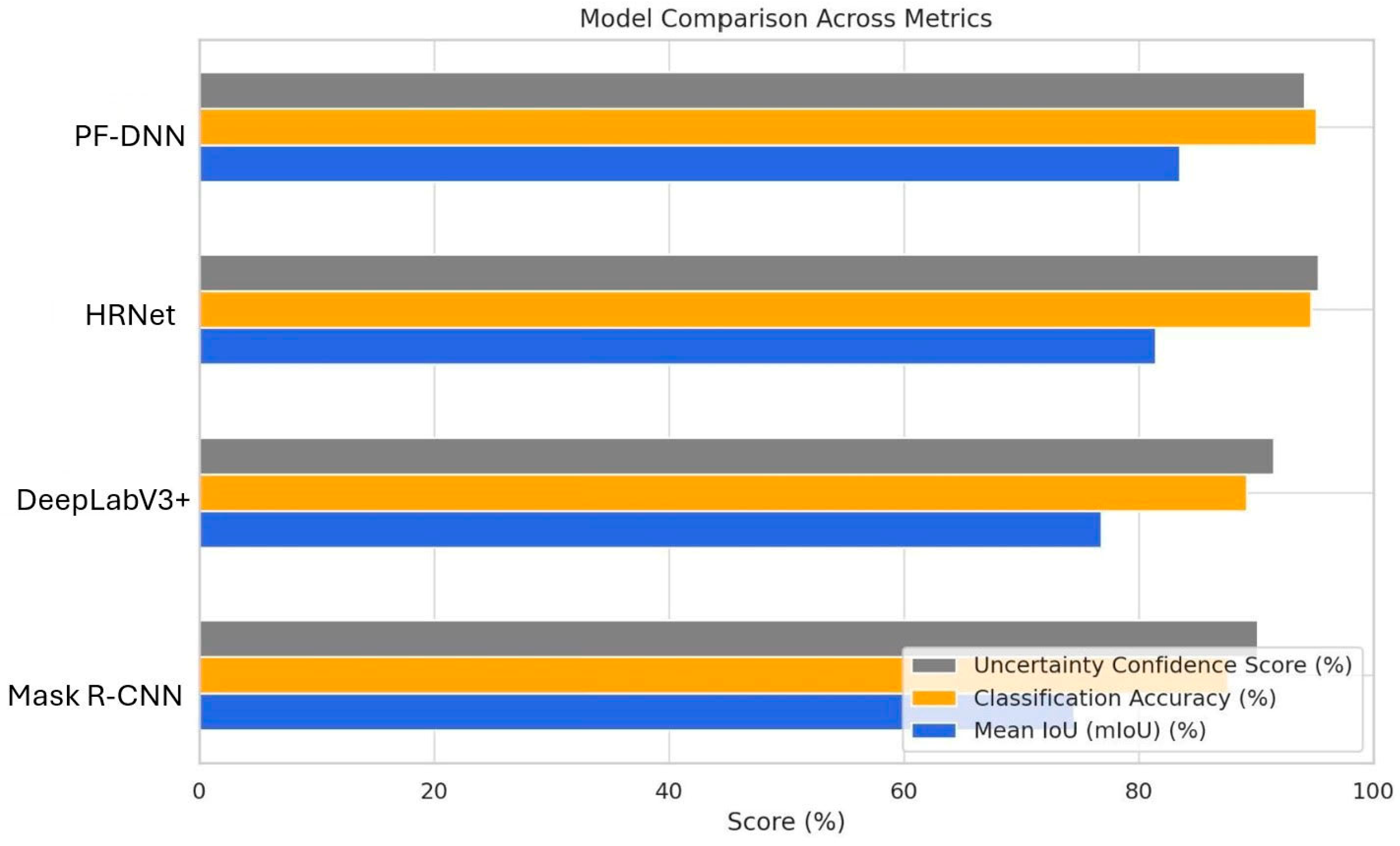 - Comprehensive Evaluation and Benchmarking against State-of-the-Art Models: Extensive simulations and quantitative analysis were conducted to validate the effectiveness of the proposed PFM-DNN framework. The results demonstrate superior performance in terms of accuracy and convergence rate (mIoU) compared to state-of-the-art models, including DeepLabV3+, Mask R-CNN, and HRNet, confirming its suitability for dynamic and complex navigation environments.