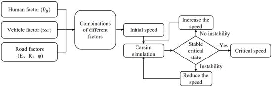 According to Equations (1) and (2), the influencing factors considered in this paper include (driving behavior), (vehicle center of mass height), , , , and . The static stability factor () is introduced as a geometric characterization parameter of the vehicle. The larger the , the smaller the possibility of vehicle instability.