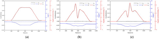 The trajectory change mainly affects the vehicle’s yaw angle and lateral acceleration. The lane-changing process induces two distinct yaw angles, as in the description in Figure 5a, causing the lateral acceleration to change accordingly. Notably, the second yaw variation exhibits a higher amplitude, with post-maneuver lateral acceleration oscillations observed. Compared with inside lane changing, outside lane changing generates greater lateral acceleration.