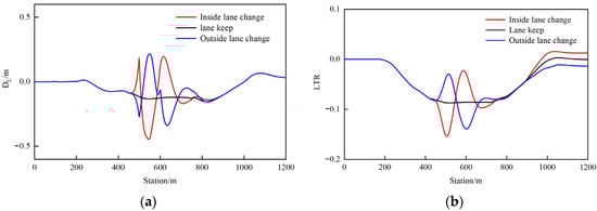 It can be seen from the lateral displacement and LTR changes in Figure 7 that lane-changing behavior has a significant impact on driving stability. As shown in Figure 7a, the lane-changing behavior of vehicles on curved sections will increase lateral slip, and the maximum slip occurs during the first turn when changing lanes to the inside. As shown in Figure 7b, the lane-changing behavior of the vehicle will intensify the degree of load transfer, and changing lanes inward is more likely to cause vehicle instability than changing lanes outward. After leaving the curve, due to the influence of suspension or inertia, the load transfer cannot completely disappear.