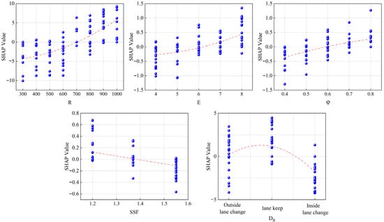 To further analyze the combined impact of the interaction effects of the key factors R and DB on the model results, a two-factor SHAP dependency graph was drawn as shown in Figure 15. When the curve radius is small, the positive impact of lane keeping (green scattered points) on the stability assessment results is greater than that of lane-changing behavior (blue and red scattered points), indicating that lane-changing behavior increases the risk of instability on small-radius curves. As the radius of the curve increases to approximately 700 m, the influence of this interaction effect gradually weakens, and the scattered points of different colors are randomly distributed. When the curve radius increases to 700 m or more, the influence of the interaction effect on the stability assessment results is no longer obvious, indicating that when the curve radius is small, lane-changing behavior will seriously affect the stability state of the vehicle. When the curve radius is greater than 700 m, the specific risk of lane-changing behavior on stability is significantly reduced.
