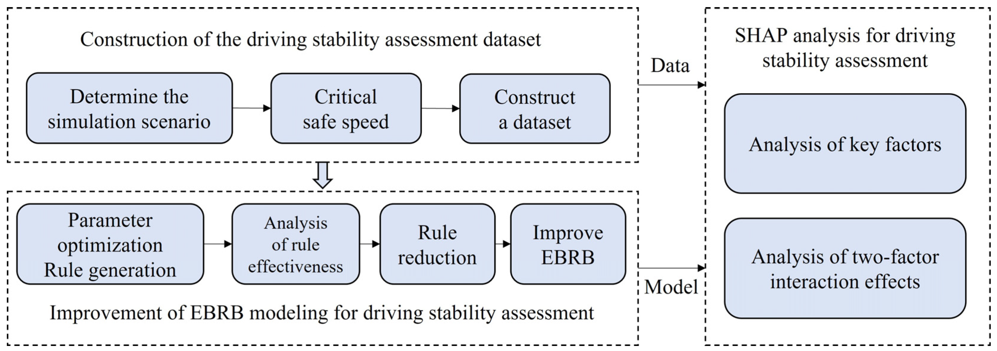 - Based on the Extended Belief Rule Base, we propose a refined methodology incorporating parameter optimization, which transforms both quantitative and qualitative inputs into belief distributions to achieve unified modeling of semantic information and uncertainty. Using the simulation-generated dataset, we validate the proposed model’s accuracy in driving stability assessment.
