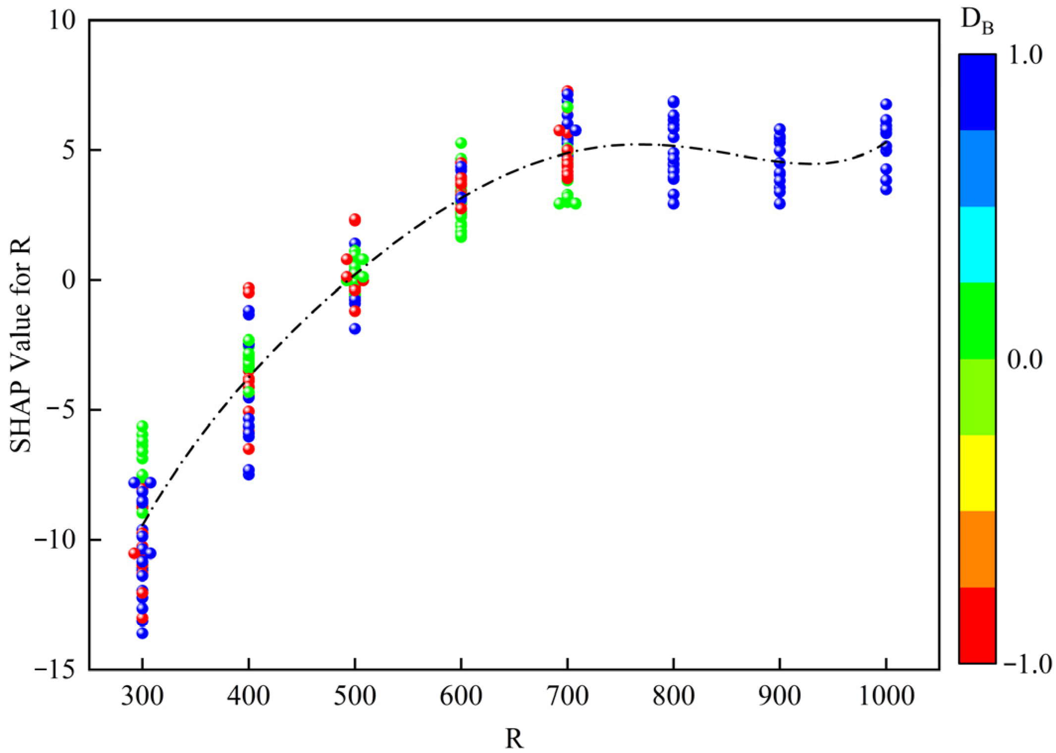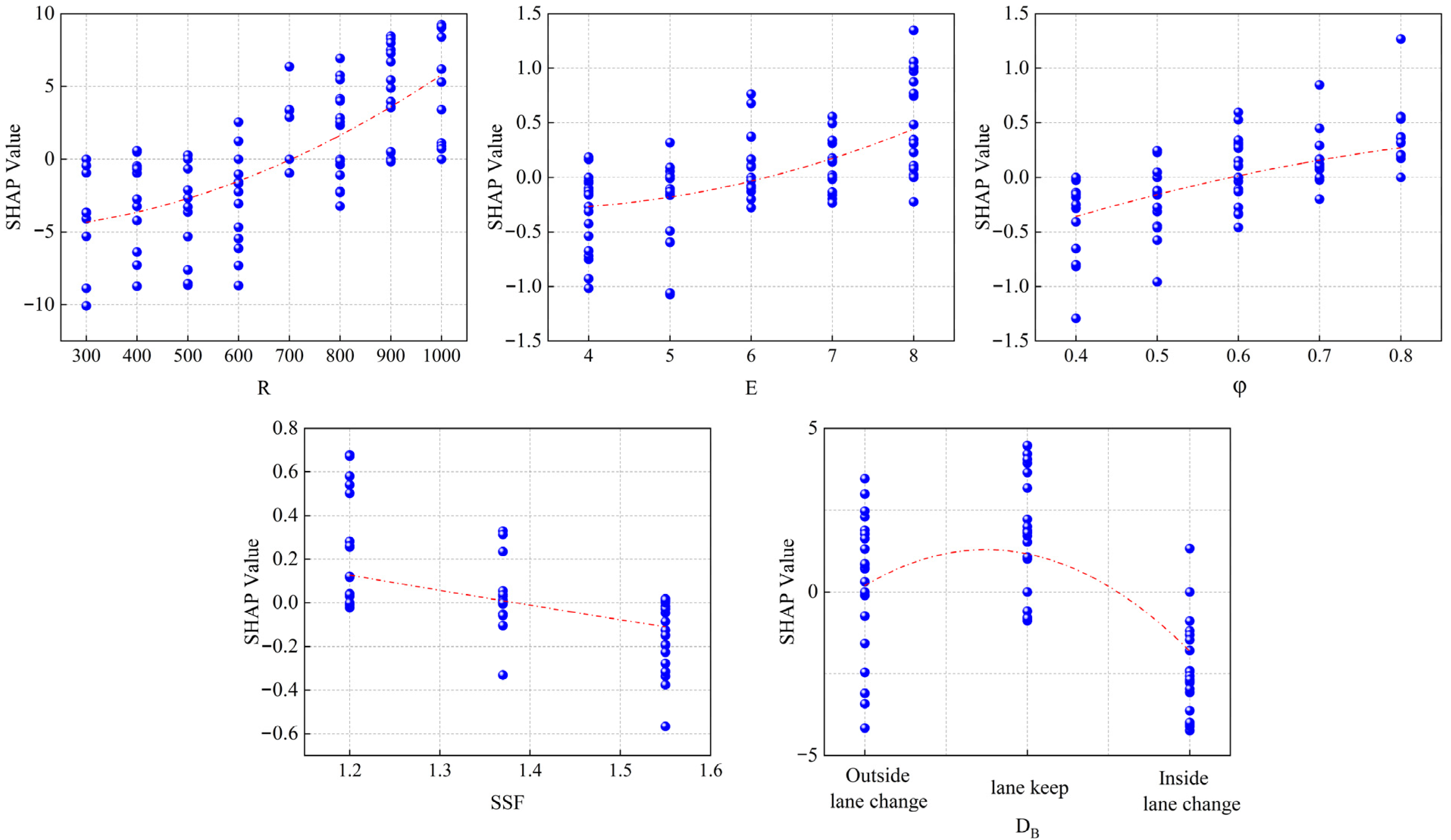 - The interpretability analysis based on SHAP reveals the intrinsic mechanism that affects driving stability. The radius of the curve and lane-changing behavior are the key factors affecting the driving stability on curved sections. For the first time, the unique interaction effect between the two was quantified: the negative impact of lane-changing behavior on driving stability on small-radius roads is more obvious. When the radius of the curve reaches 700 m or more, the interaction effect weakens. The research results will provide a basis for the study of vehicle speed management, driving behavior decision-making and trajectory planning on complex linear road sections.
