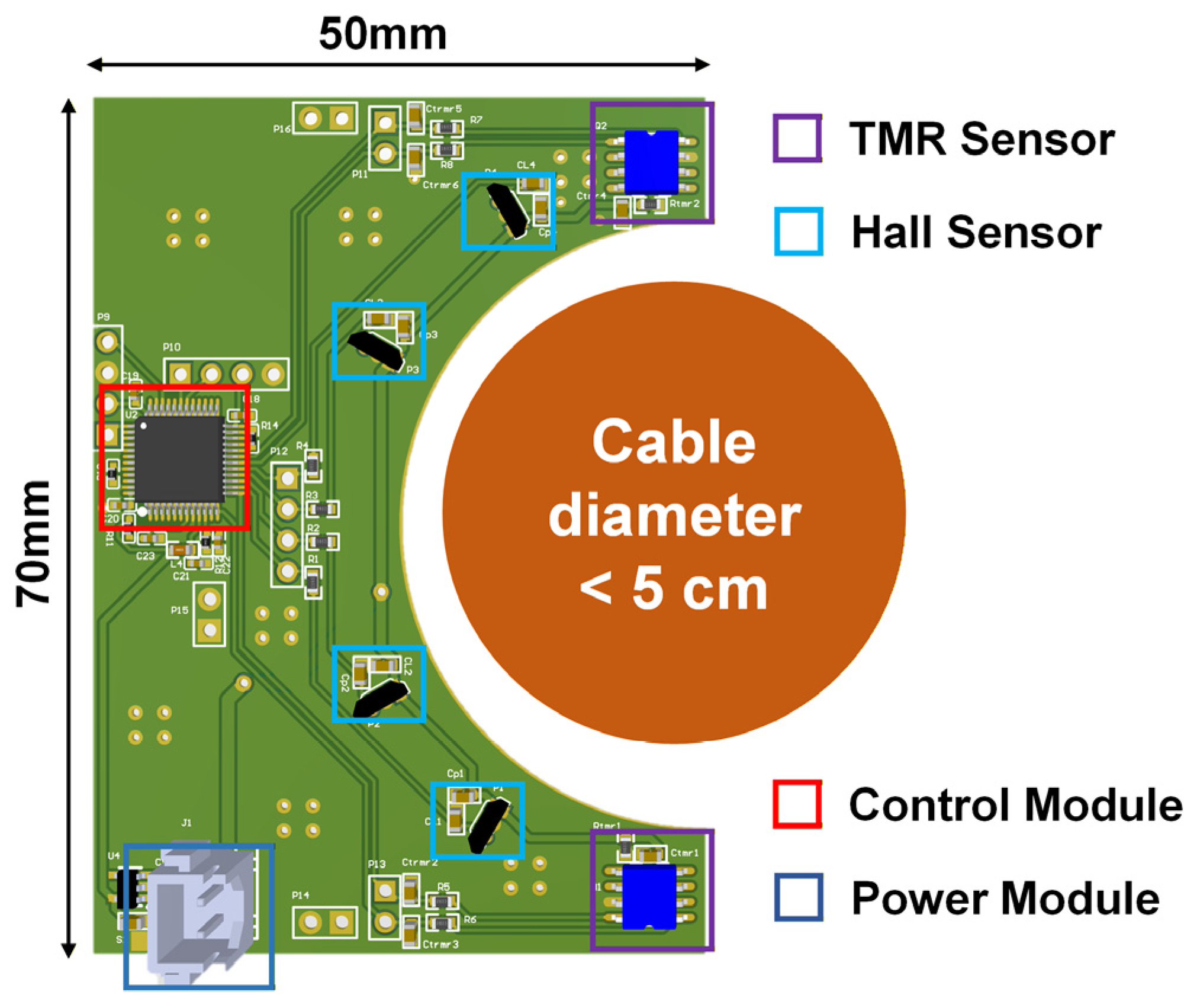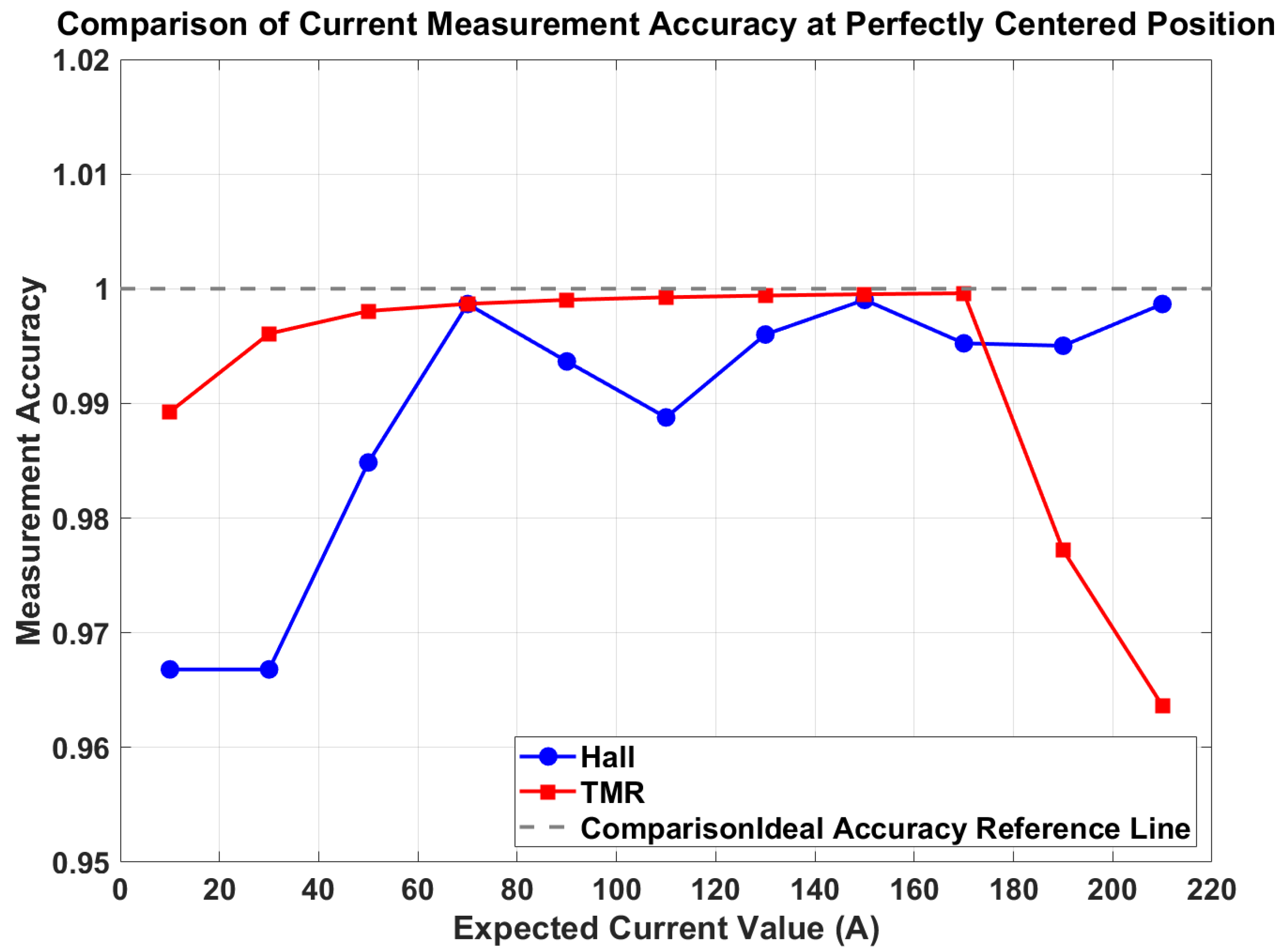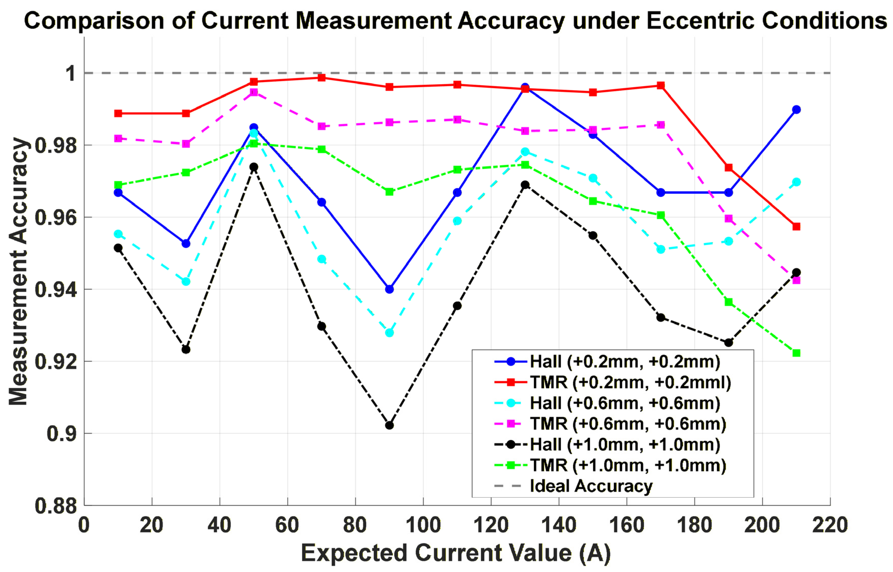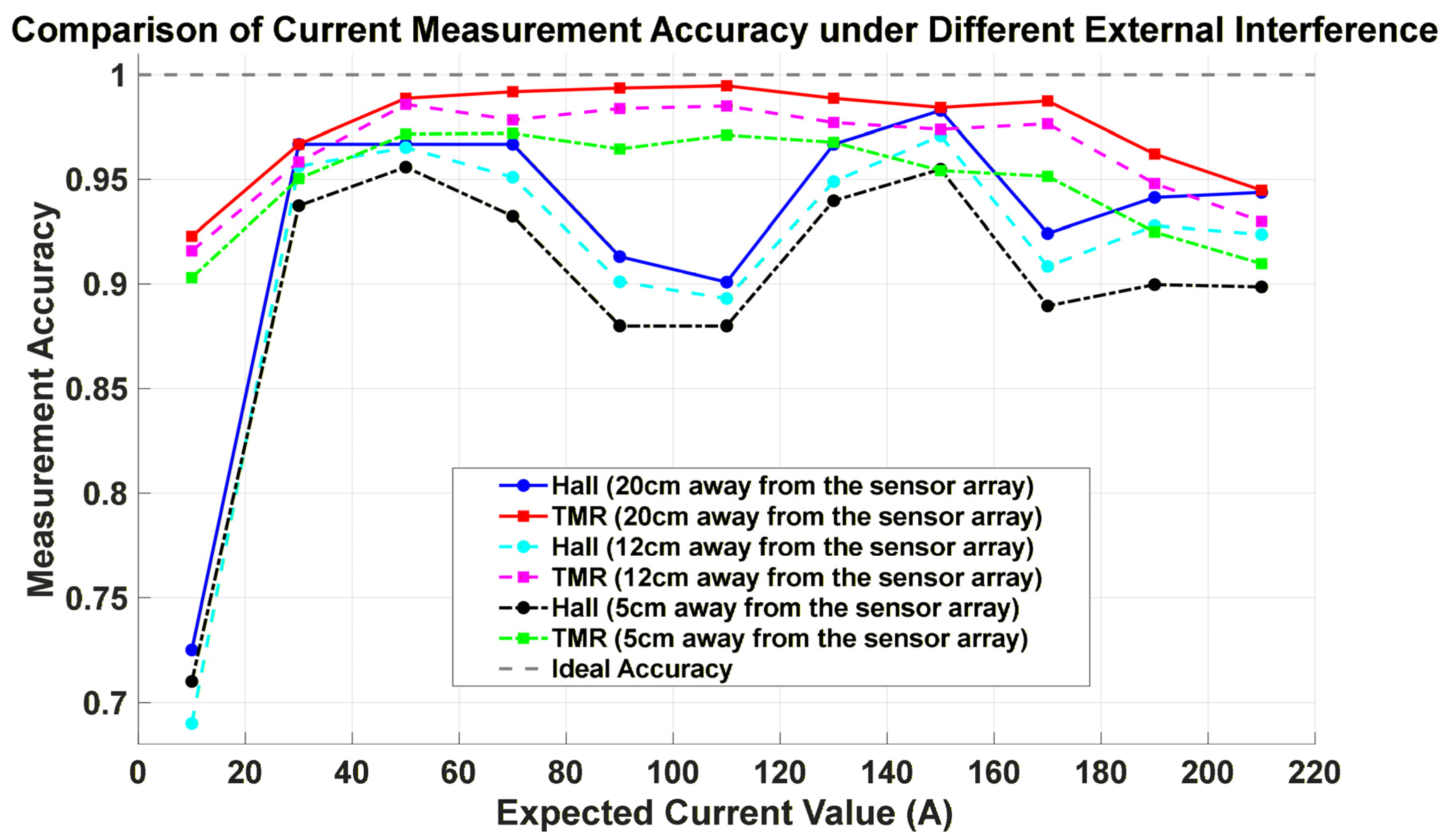A hybrid sensing scheme combining Hall-effect and TMR sensors was implemented, leveraging the complementary characteristics of wide dynamic range and high sensitivity. Hall sensors provide a wider linear range (±10 Gs), maintaining high accuracy (>99%) above 130 A, but exhibit lower sensitivity at low currents. They are also prone to greater temperature drift. In contrast, TMR sensors offer superior sensitivity and temperature stability, achieving >99% accuracy within 30–170 A. However, their narrower linear range (±5 Gs) leads to saturation and accuracy loss at high currents (e.g., 96.36% at 210 A). Additionally, TMR sensors are subject to inherent magnetic hysteresis, which may affect linearity and repeatability under high or varying fields. The combined use of both technologies effectively balances dynamic range with precision. Under ideal installation conditions, the system achieved an overall measurement accuracy of 99.05%.