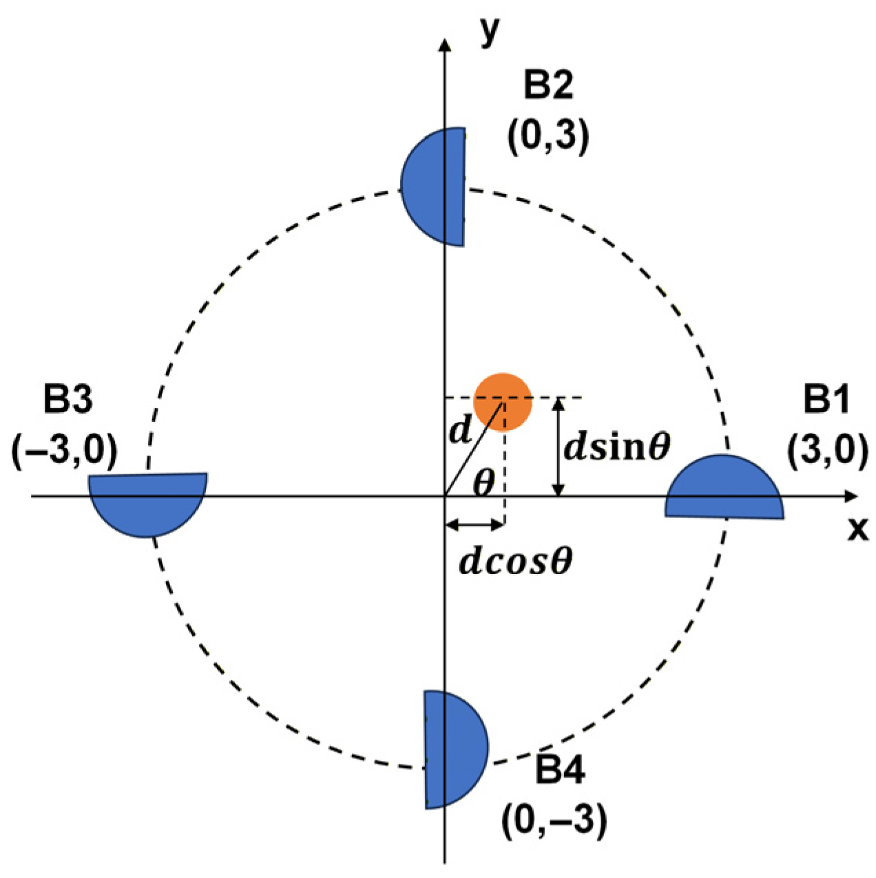 When a current-carrying conductor deviates from the geometric center of the sensor array, the distance between each sensing element and the conductor varies, leading to systematic deviations in the measured magnetic field values. According to Equation (1), the magnetic flux density generated by an infinitely long straight conductor is inversely proportional to the distance from it. For clarity and ease of understanding, the geometric characteristics of a circular sensor array are first considered at this stage, and a coordinate system is established as shown in