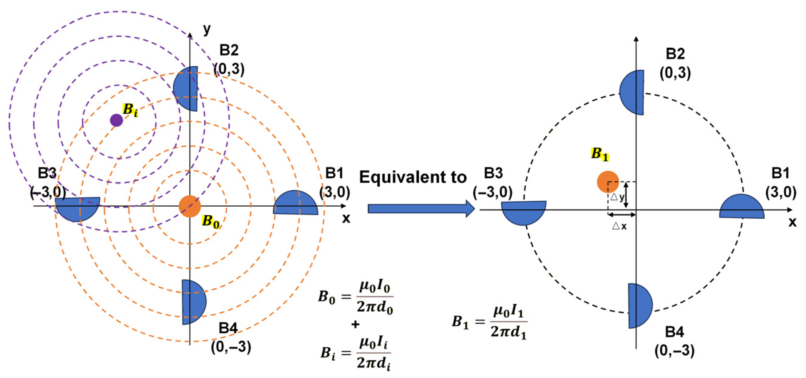 To address this issue, this study introduces a theoretical method based on magnetic field distribution equivalence. This approach converts the magnetic-field superposition caused by a single interference source into an equivalent conductor position offset problem, as illustrated in