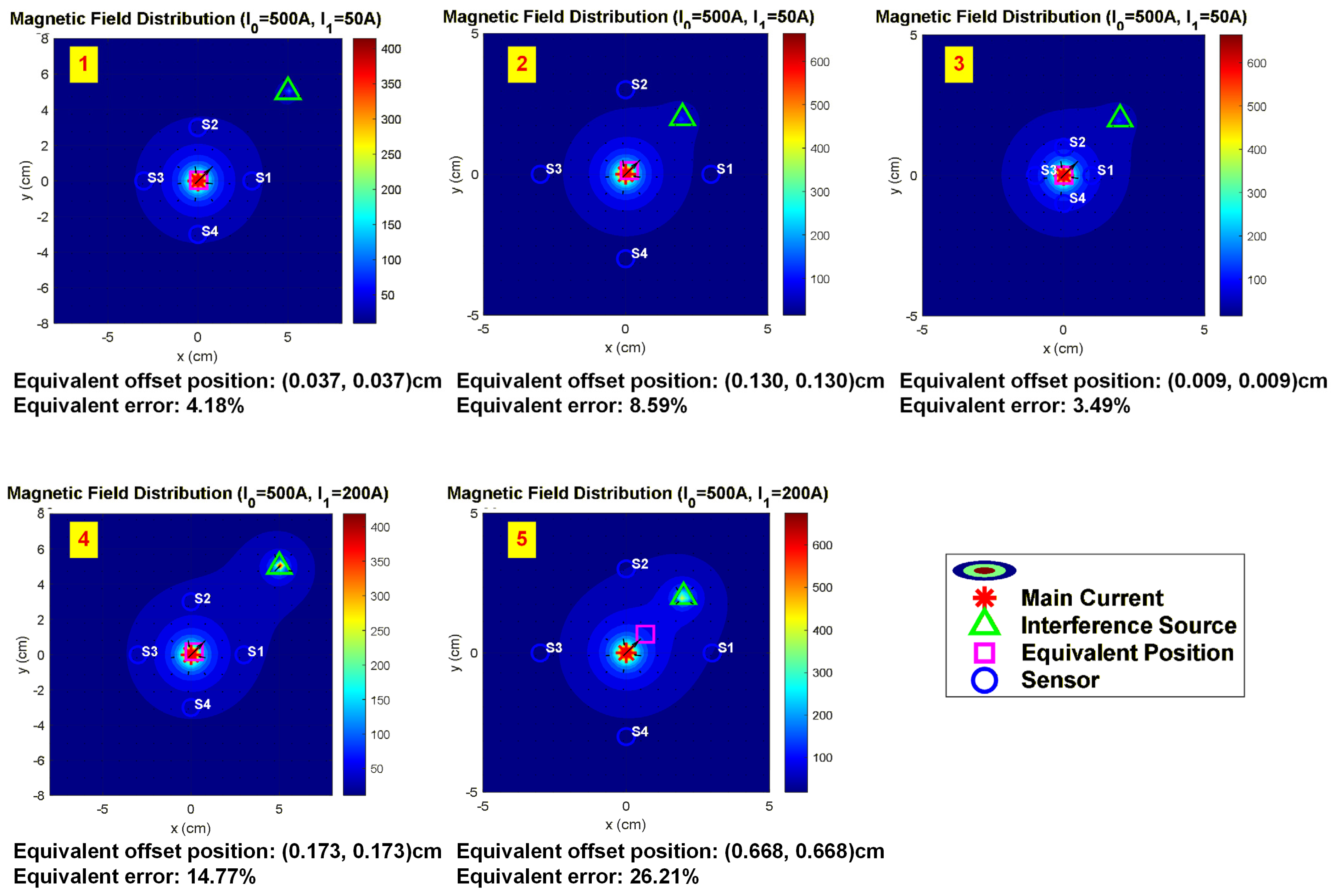 To validate the effectiveness of the equivalent model under interference conditions and define its applicable boundaries, a series of simulation experiments were conducted using MATLAB R2024b. Adopting a controlled variable approach, the influence of key parameters—including interference source intensity (comparing cases 1 vs. 4 or 2 vs. 5), interference source distance (comparing cases 1 vs. 3), and array distance from the primary current (comparing cases 2 vs. 3)—on the error of the equivalent model was systematically investigated. The quantitative results of this analysis are summarized in
