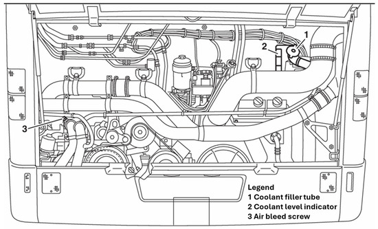 Several tests were carried out with the vehicle’s engine running, reproducing and simulating the actual operating conditions of the engine at the time of the accident. We found that the surfaces in the engine compartment with temperatures above the ignition value (value ≥ 500 °C) are the exhaust collector, the exhaust pipe next to the exhaust manifold (exhaust collector) and the turbocharger turbine body. The components that, due to their position, are most likely to be hit by oil droplets from the burst hydraulic pipe are the exhaust manifold and the exhaust pipe next to the exhaust manifold, as shown in Figure 10.