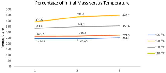 The results of these tests are summarized in Table 5, which shows the initial mass of each sample and whether it was new or used oil (Figure 7 and Figure 8). The tests began at room temperature, which, depending on the test, was between 20 °C and 31 °C, and all ended at 1200 °C. These tests were carried out at a heating rate of 10 °C/min in a synthetic air atmosphere consisting of 20% by volume of O2 (oxygen) and 80% by volume of N2 (nitrogen), which closely represents an air atmosphere. These tests show the temperatures at which the samples have 95%, 90%, 50% and 10% of their initial mass, which gives a good idea of the temperature range at which the combustion reaction of the oil samples with the air takes place [28].