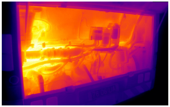 Temperature measurement tests were also carried out in the engine compartment of an identical vehicle, using an infrared camera, namely: FLIR SC660 IR Camera, which allows analysis of equipment temperature profiles, enabling fault detection.