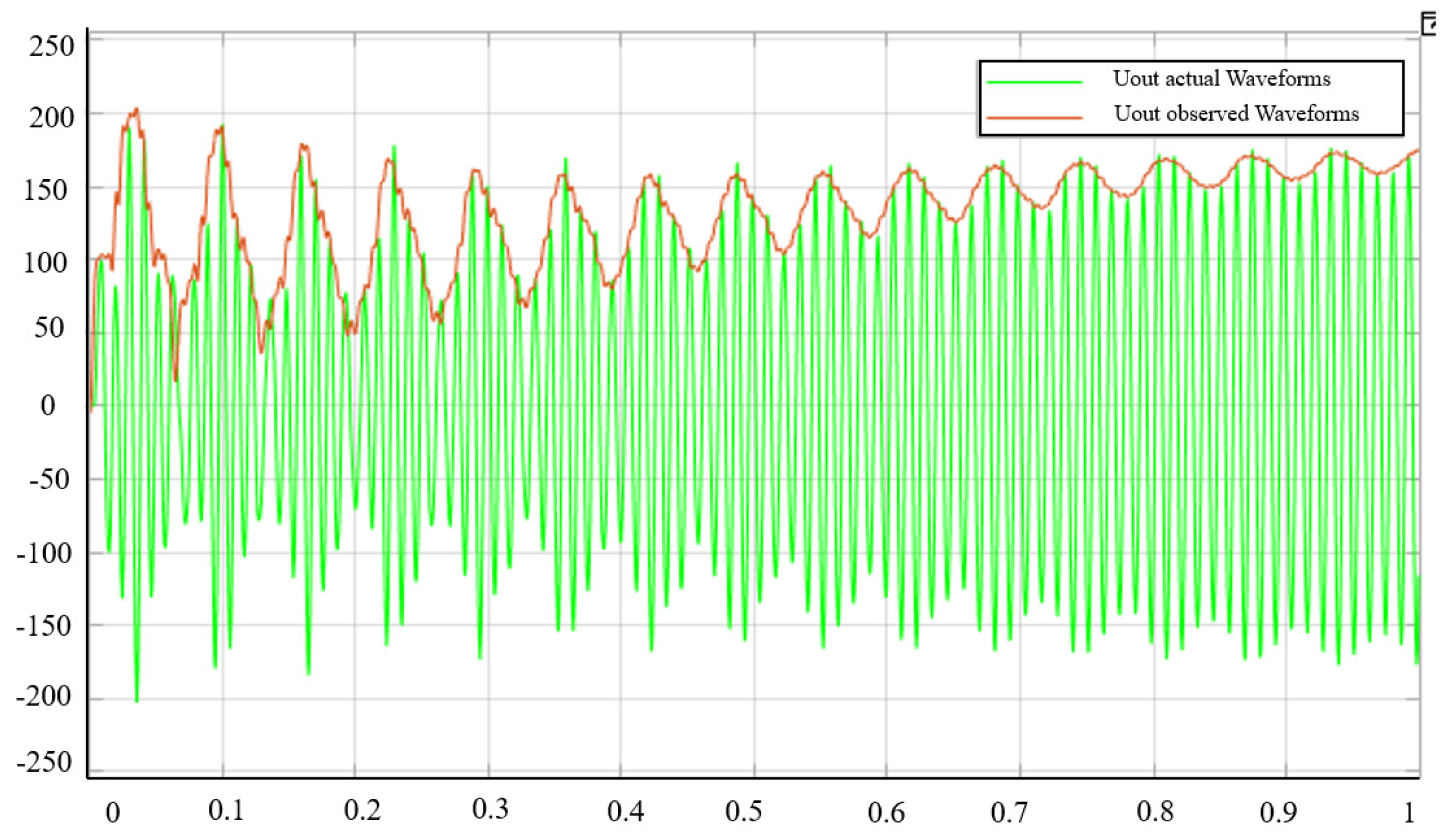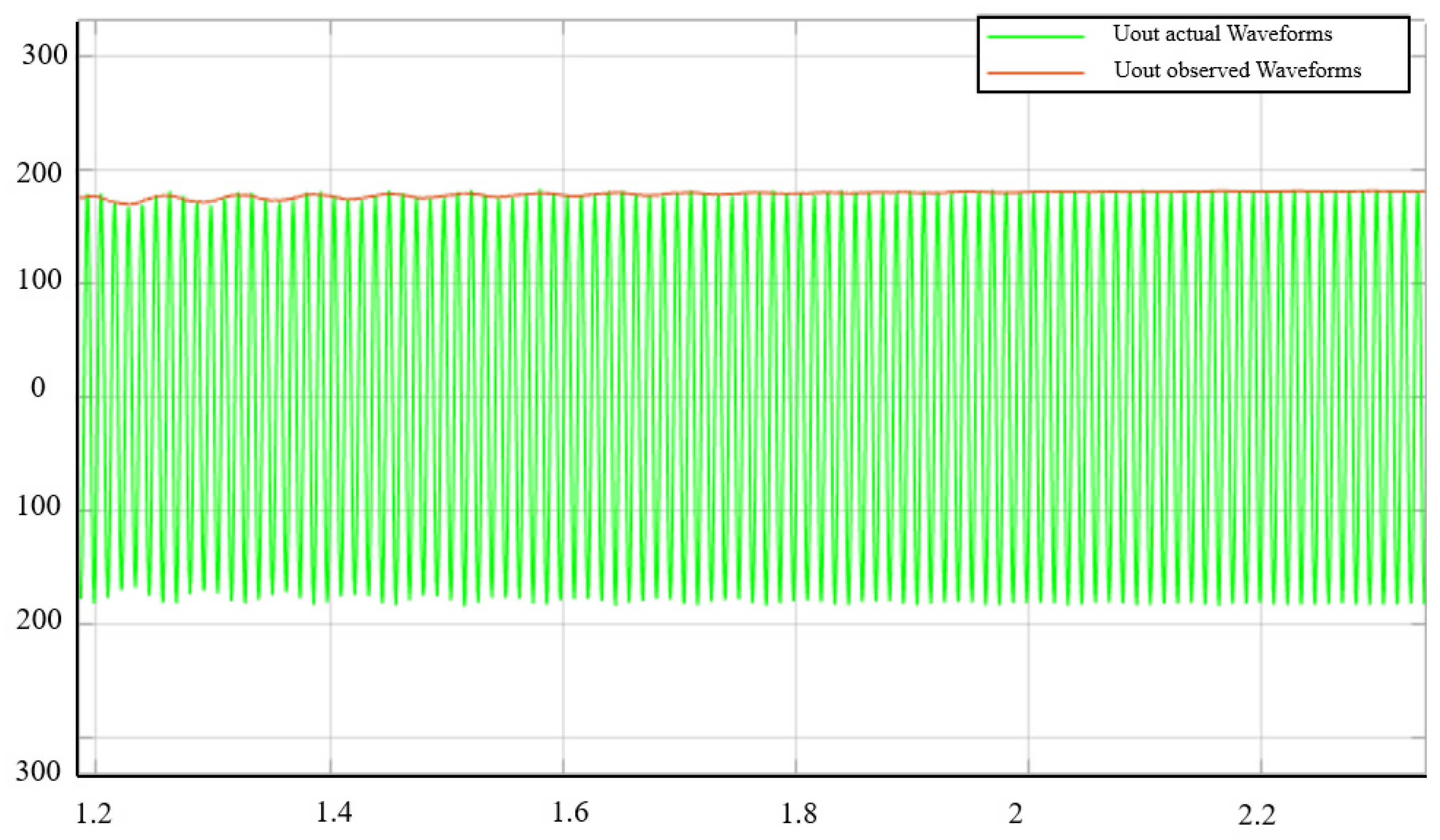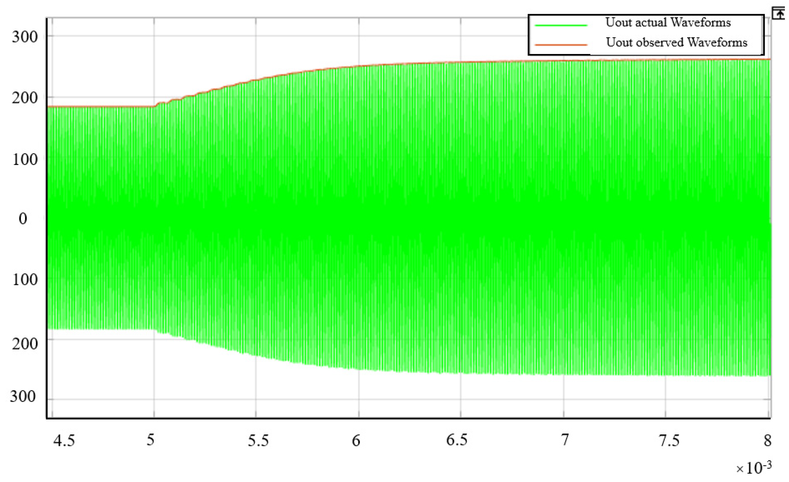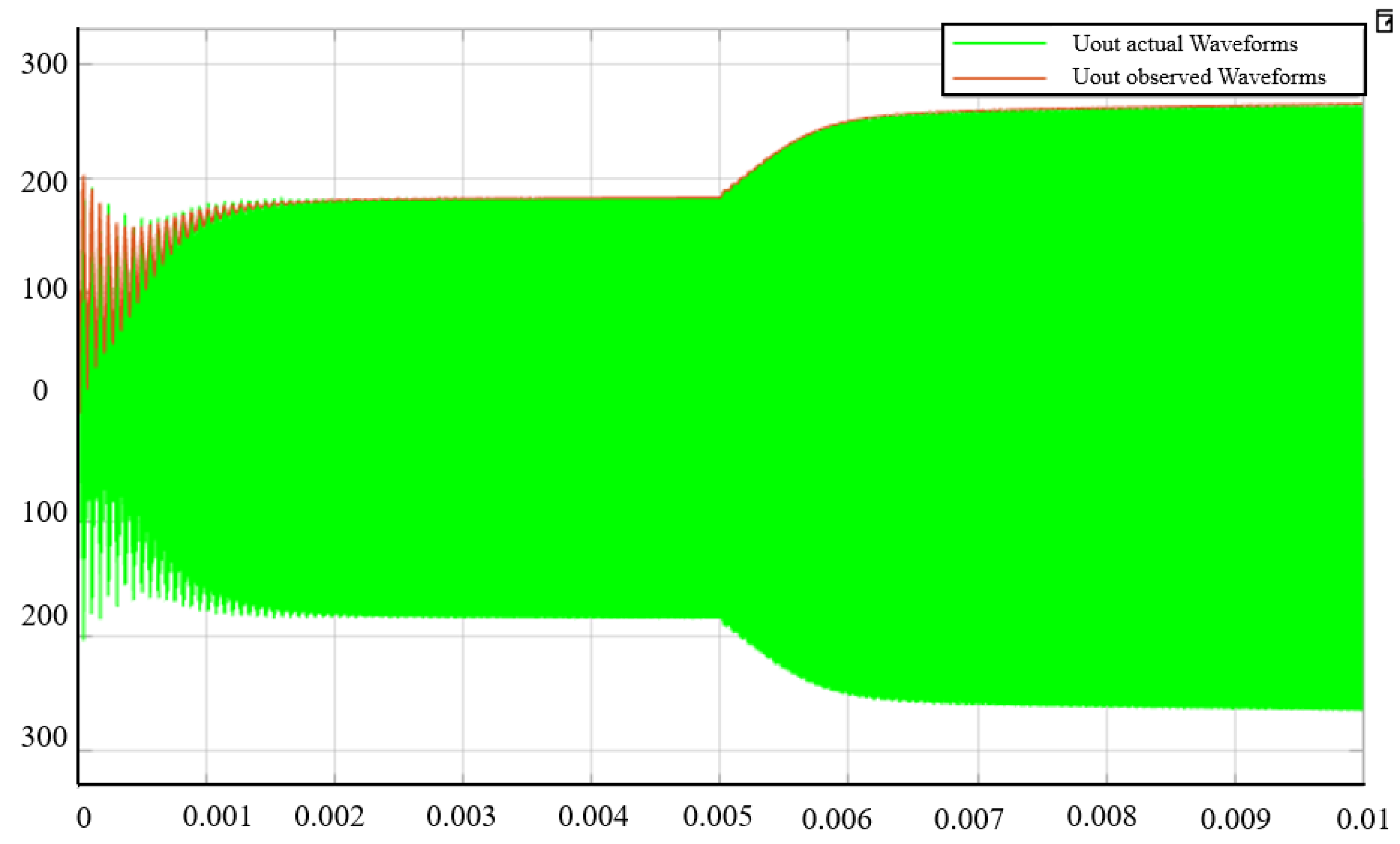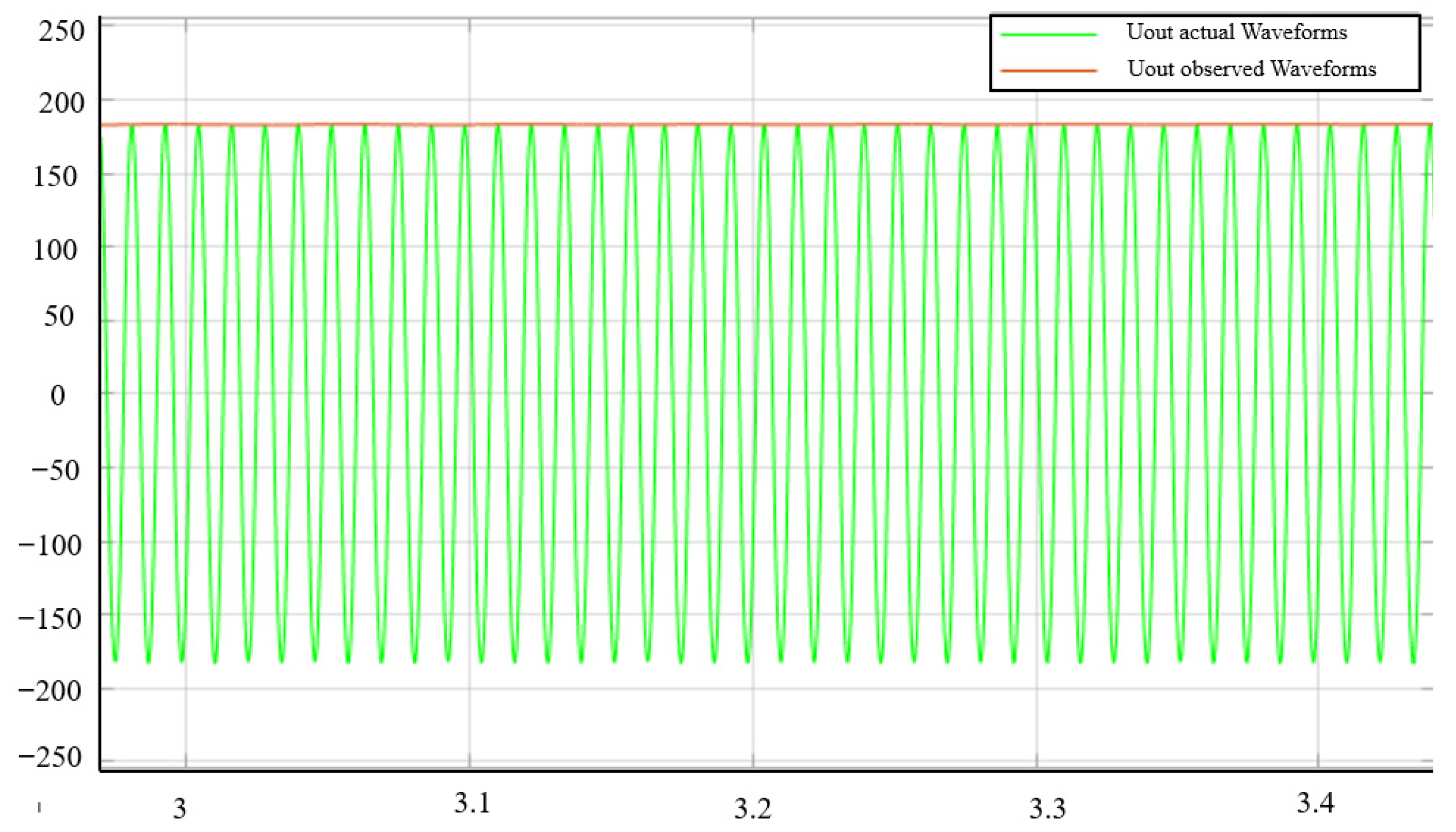 Figure 6, and at this time, it can be seen that the system completes the tracking observation after experiencing a time of about 0.0018 s. At this time, the amplitude of the output voltage of the observer and the amplitude of the voltage at the two ends of the actual load are the same.