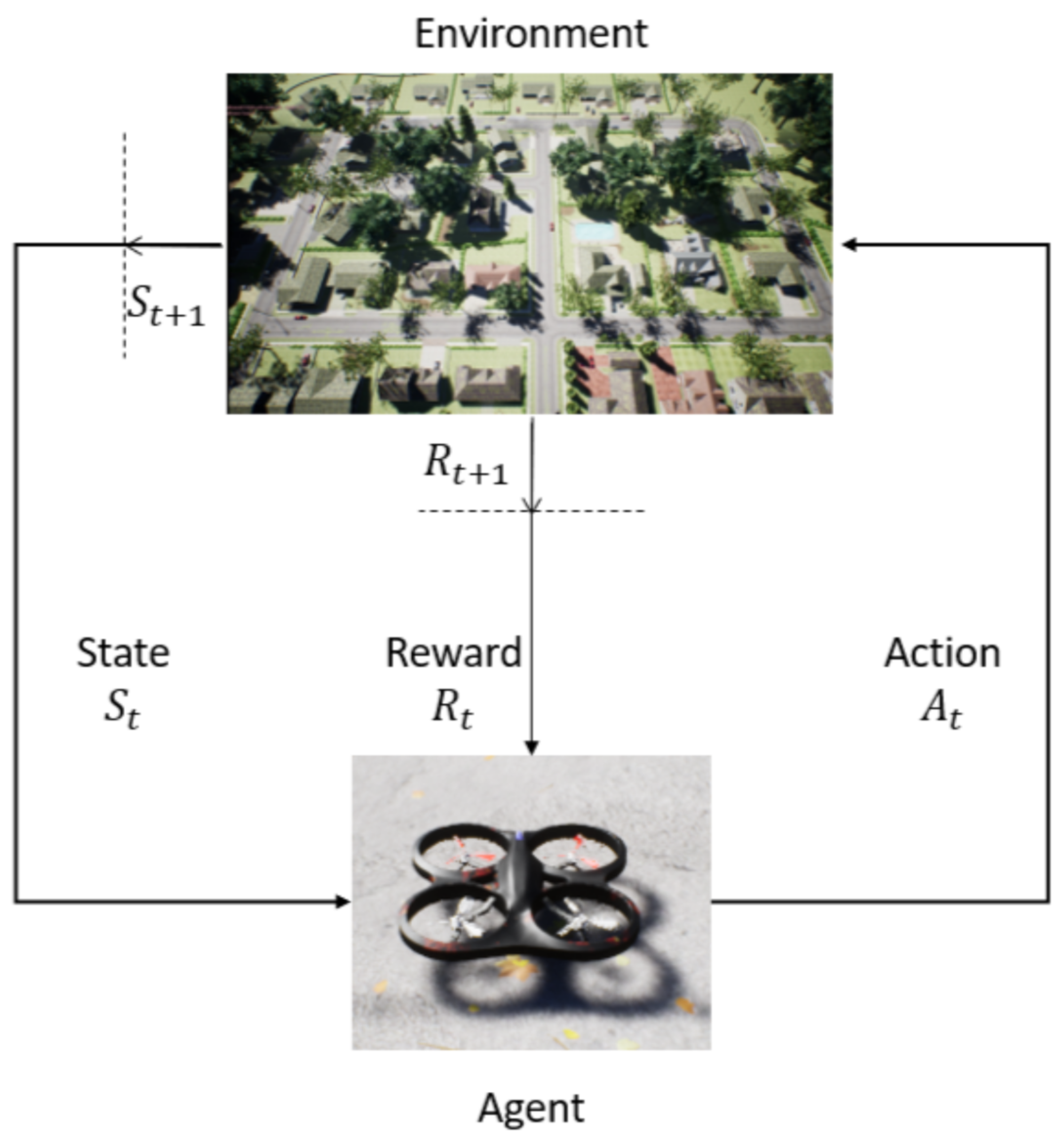 - Sheng, Y.; Liu, H.; Li, J.; Han, Q. UAV Autonomous Navigation Based on Deep Reinforcement Learning in Highly Dynamic and High-Density Environments. Drones 2024, 8, 516. [Google Scholar] [CrossRef]
