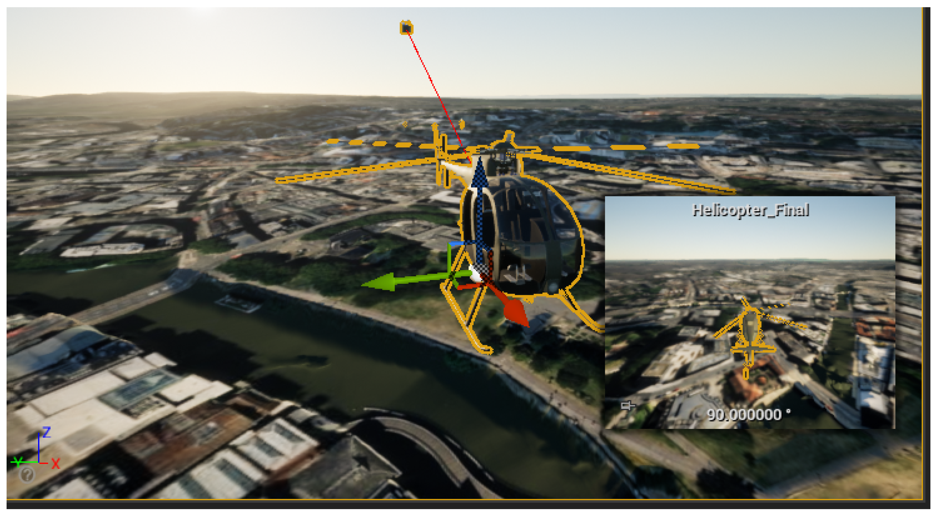 Helicopter Path Generation: The autonomous helicopter was implemented as a non-reactive dynamic obstacle following a predetermined, straight-line flight path using Unreal Engine’s waypoint system and behavior trees. This path was geo-correct and maintained a constant altitude of 100 m, compliant with low airspace regulations.