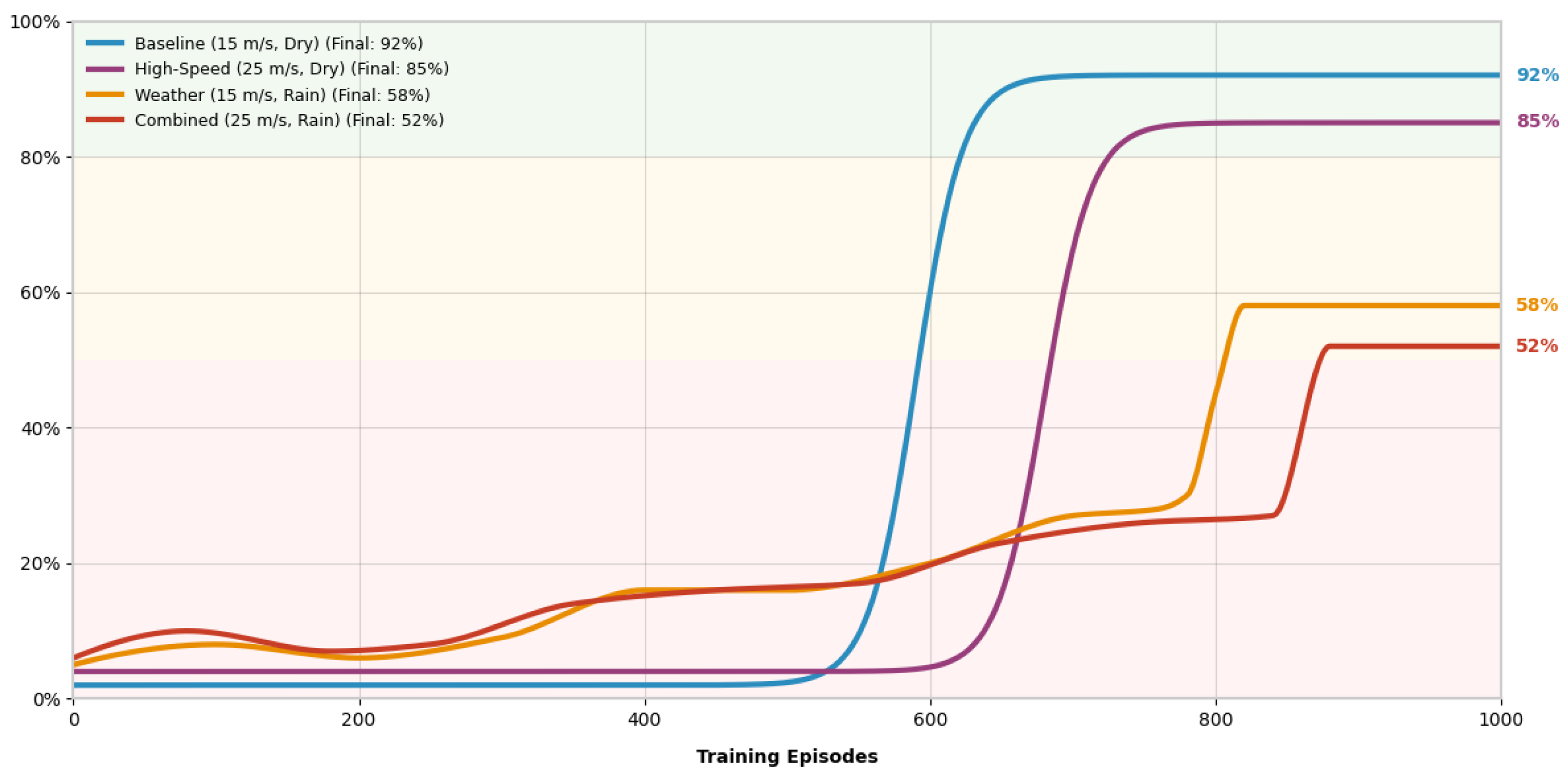 Curriculum learning proved effective in enhancing PPO robustness, enabling partial recovery from 60% to 85% accuracy in high-speed scenarios. The sigmoidal learning trajectory across all conditions demonstrated successful policy optimization, while the performance differentials revealed specific limitations requiring targeted improvements in perception and decision-making under adverse conditions.