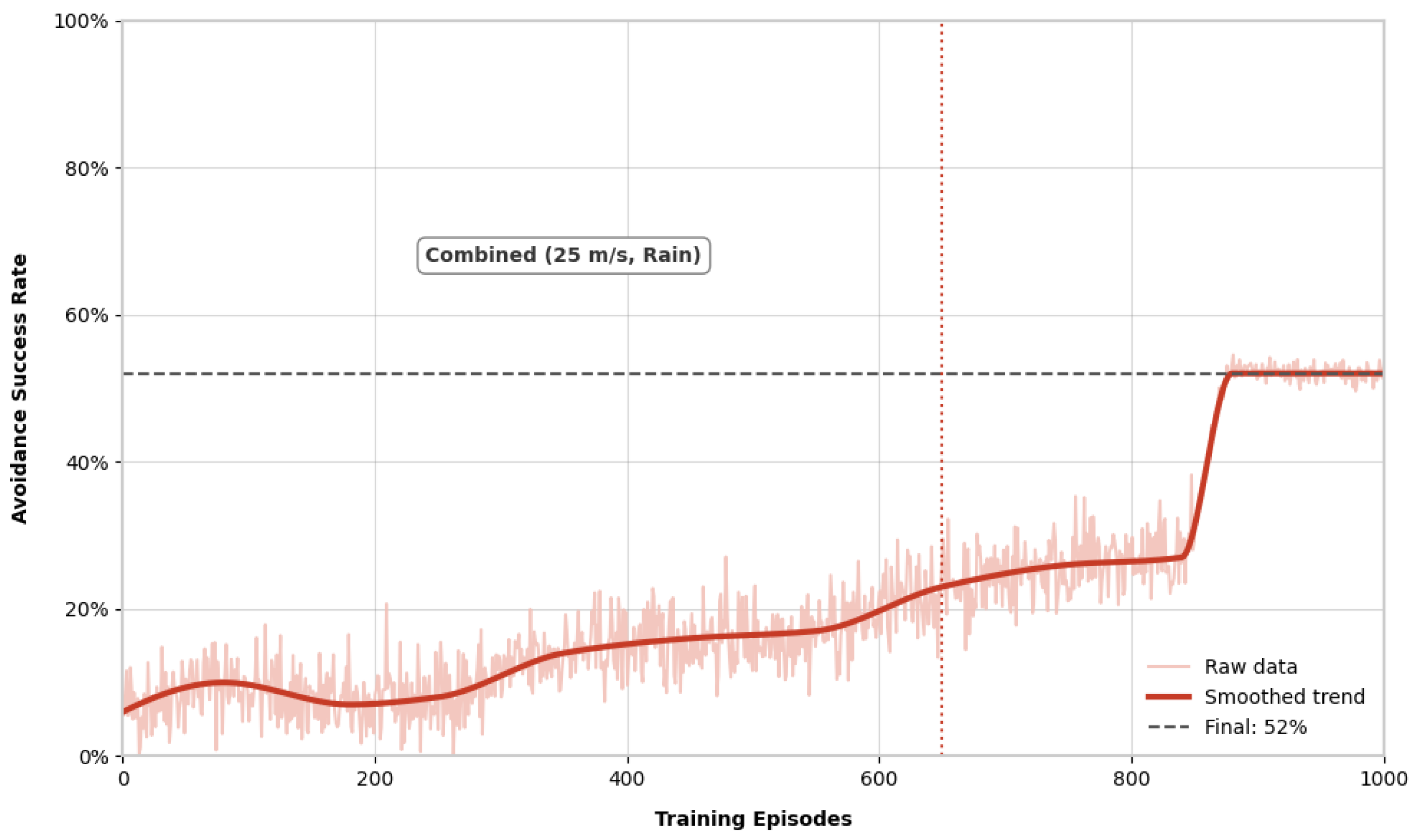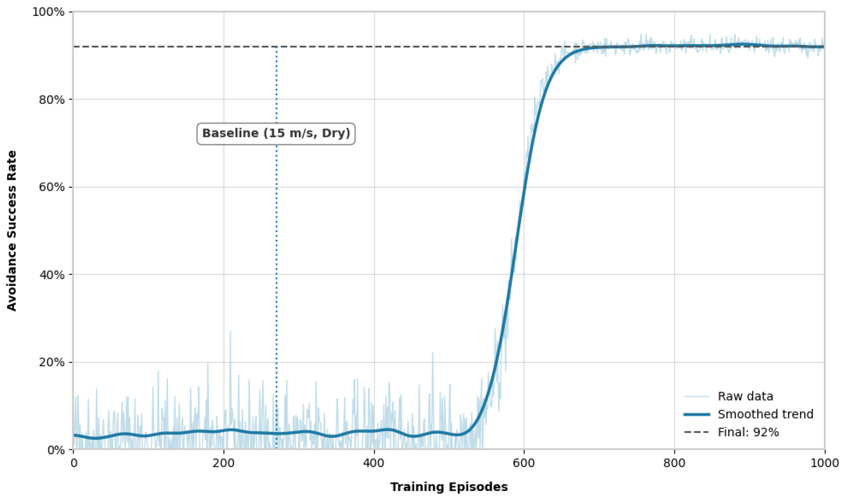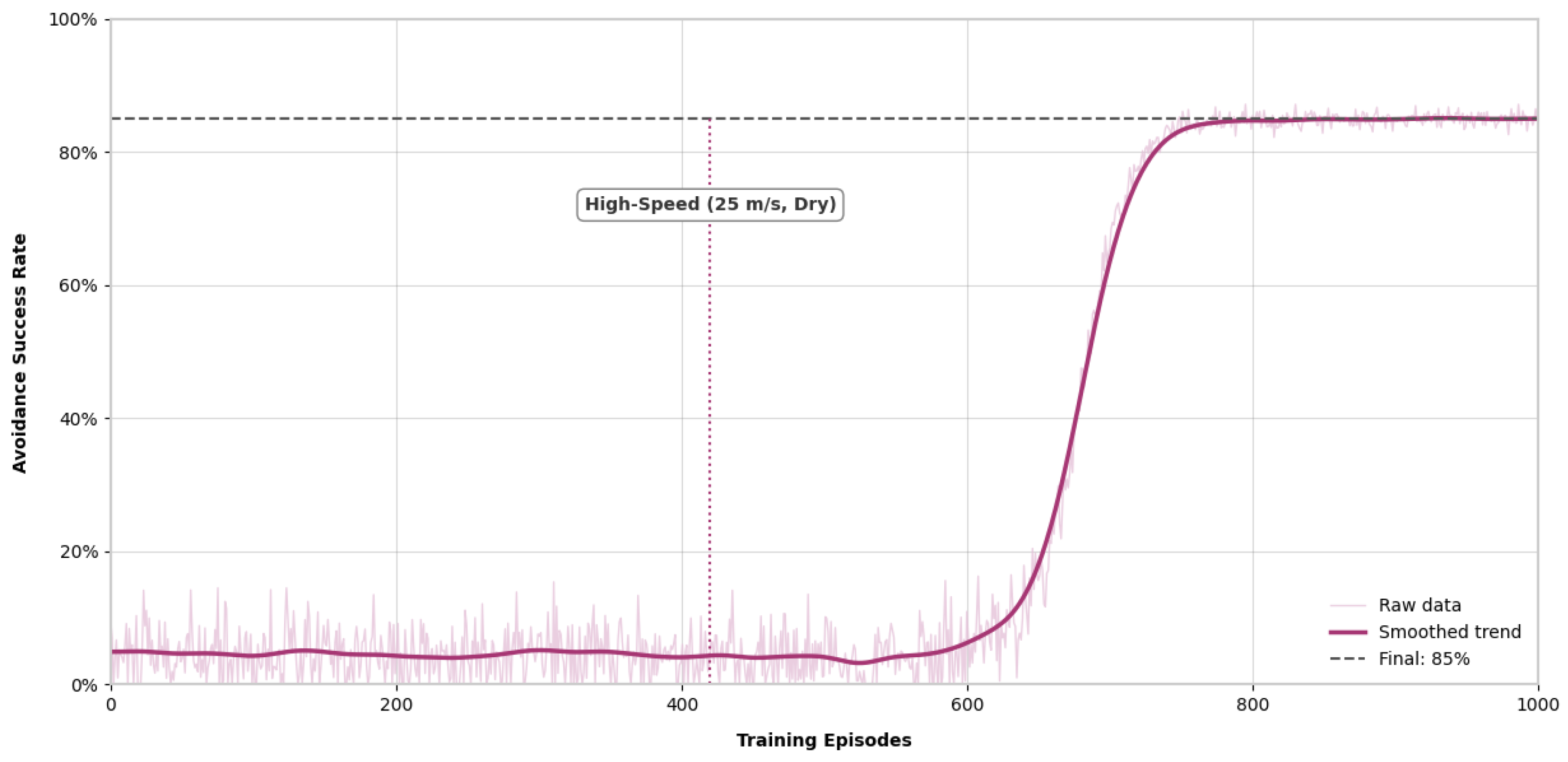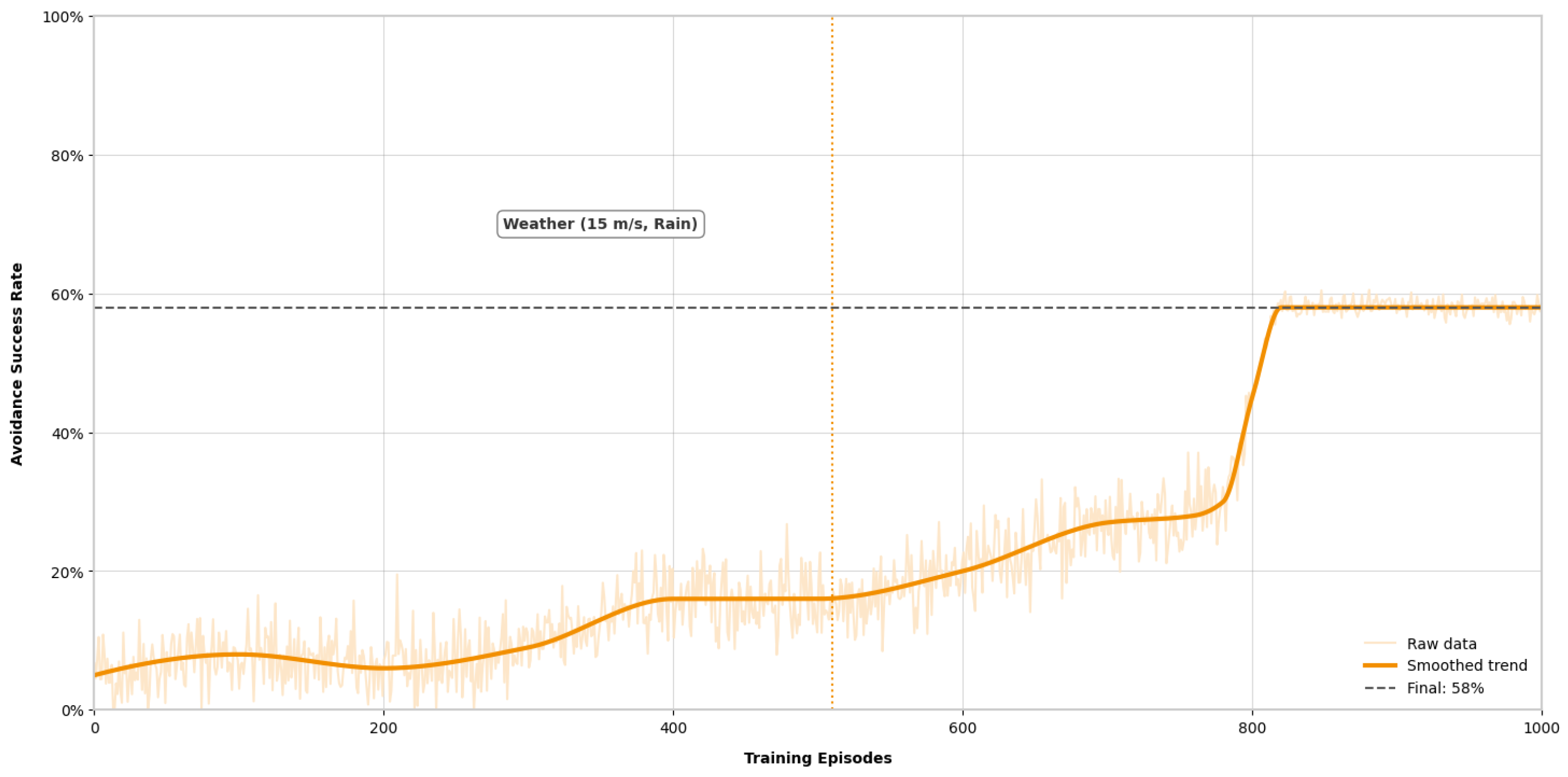 Figure 6) exhibited a sigmoidal trajectory. During the initial 0–400 episodes, the avoidance success rate remained low (<20%). A period of rapid improvement occurred between 400–600 episodes, eventually reaching a peak success rate of 92% by episode 1000.