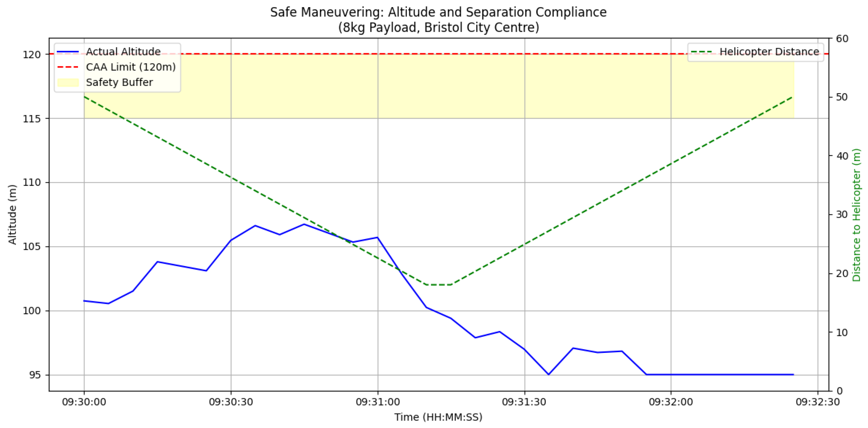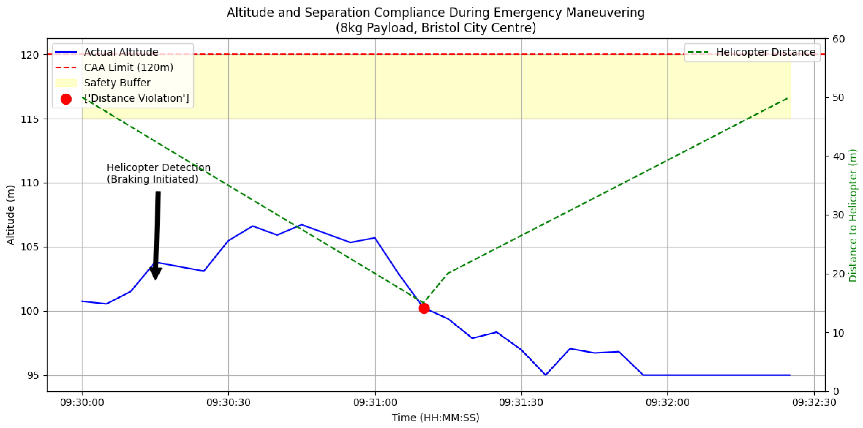 The experimental data, comprehensively logged via SQL database, demonstrates consistent compliance with UK Civil Aviation Authority altitude regulations. The drone maintained operations within the 120-m ceiling while achieving minimum 5-m clearance above Bristol’s tallest structures. However, the safety margin violation under rainy conditions highlights critical safety implications. The exceedance of the 15-m safety margin during rain-induced braking performance degradation (19.3 m vs. 15 m threshold) underscores the necessity for weather-adaptive safety buffers in autonomous navigation systems. Specifically, kinematic analysis confirms that because the drone’s braking distance extends to 19.3 m under adverse weather (8 mm/h rain), any horizontal safety threshold below that is physically impossible to maintain safely; the drone would inherently breach the boundary simply by executing an emergency stop. Therefore, a threshold of 20 m must be accepted as the minimum functional buffer required to safely accommodate the UAV’s worst-case deceleration profile while satisfying the aviation mandate to remain well clear of manned aircraft.