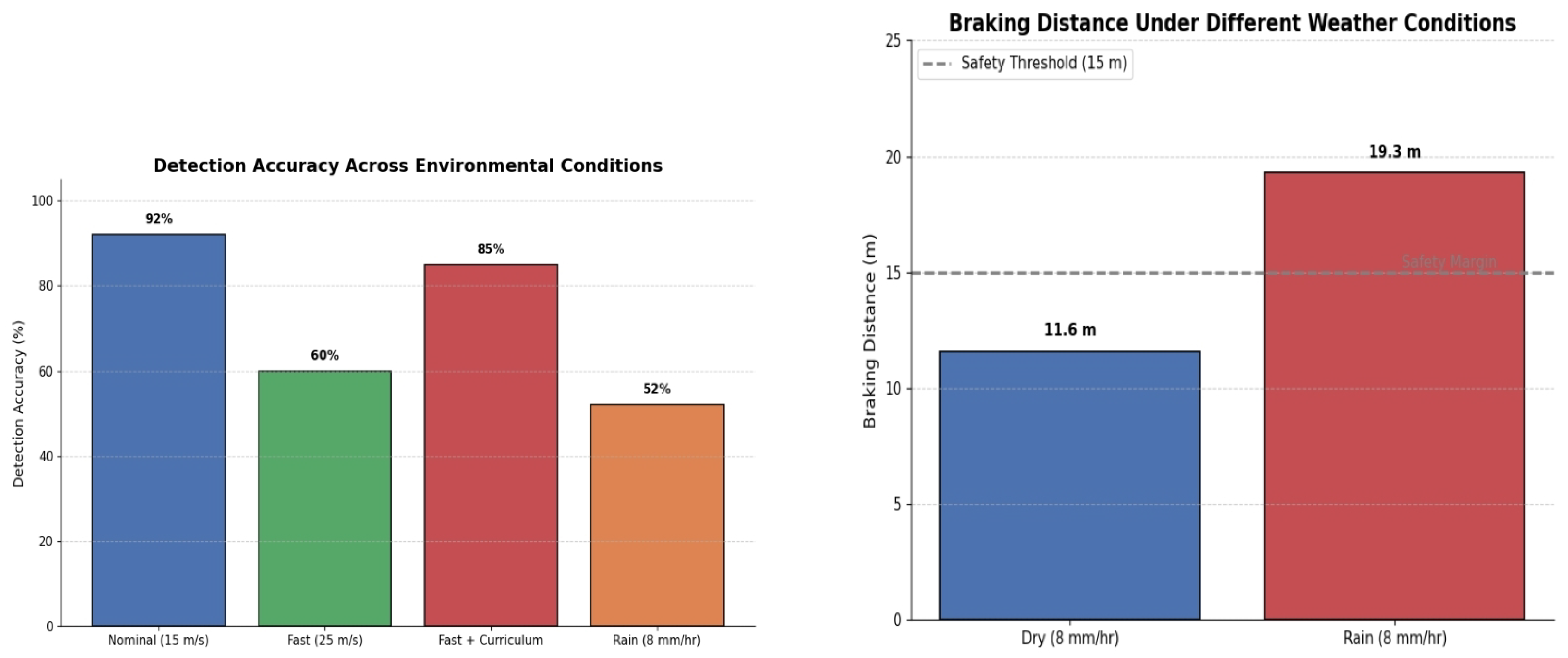5]. The 40% reduction in deceleration performance under rainy conditions, resulting in braking distance increase from 11.6 m to 19.3 m illustrated in