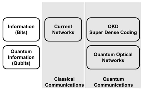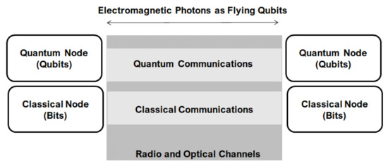 Quantum Optical Communications leverages on the idea of using photons, the quanta of the electromagnetic field, as flying qubits, which have the scope to transport qubits from a physical quantum emitter—through the network for conveying quantum information—to a physical quantum receiver (Figure 4).