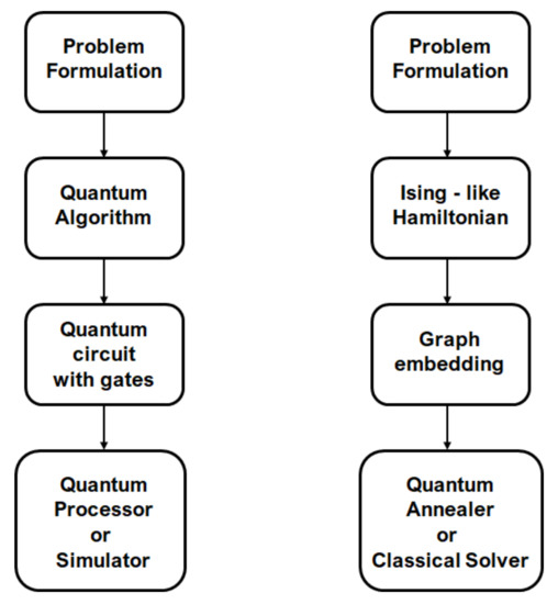 Quantum algorithms workflows: on a gate-model computer (left), on a on a quantum annealer (right).