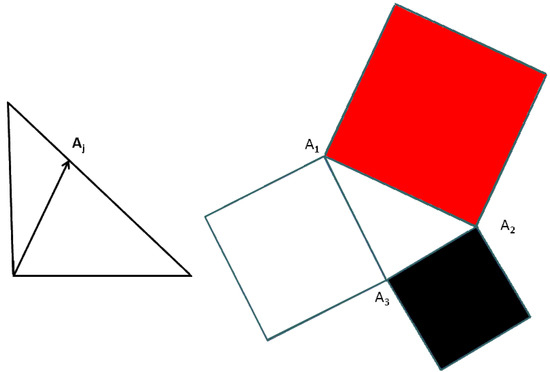 We construct the squares on sides , , and of triangle . We paint the squares in different colors: The square with side is red, the square with side is black, and the square with side is white. Thus, the state with density matrix can be geometrically described either by the point in the Bloch ball or by the three squares on the plane, called the Triada of Malevich’s squares. This approach was called quantum suprematism [40,42,43].