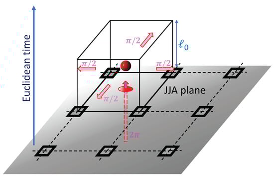 where is the lattice Chern–Simons operator [] (see Section 4). Here, and are fictitious gauge fields representing conserved charge and vortex fluctuations by their dual field strengths, and , respectively. The first term in the action is the topological mixed Chern–Simons term [] between these two types of dual fluctuations. The integers are the electric topological excitations of the system, the integers are the magnetic topological excitations. Together with the vortex number , the latter form a three-current which is conserved due to the gauge invariance in the gauge sector, . Due to this constraint, only the two integers are the independent degrees of freedom. From the point of view of the original Minkowski space-time, the three-current describes events in which one vortex disappears from the array, the flux being “carried away” by the spatial vortex currents . From the Euclidean space-time point of view, however, are the components of a 3D magnetic field. A configuration such as the one in Figure 1 thus represents a unit magnetic monopole, the JJA vortex on the lower plaquette playing the role of the Dirac string []. The integer monopole charge is . The asymmetry of the monopole, whose flux flows out only in the spatial directions, but not over a whole 3D lattice cube, is due to the deep non-relativistic limit of the JJA gauge theory. One sees in Figure 1 how the flux of the JJA vortex is divided up into four parts and is carried away by the in the spatial directions. As a consequence, on the upper plaquette of the cube, representing the same JJA plaquette one quantum of time later, there is no longer any vortex. Thus, the magnetic monopole m expresses the tunneling of the system between two different topological vacua.