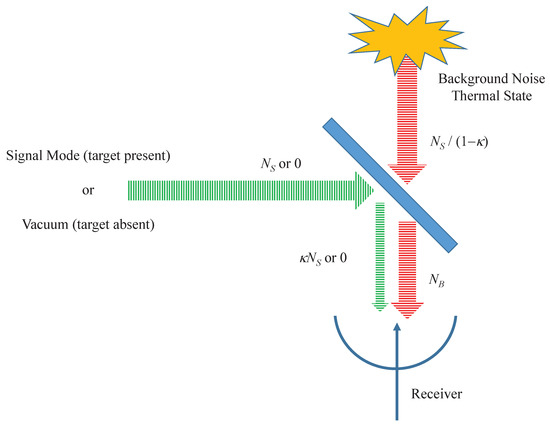 Having determined the quantum state of the transmitted field, the model of loss and noise is now introduced. This model, widely used in the literature on quantum illumination [10,14], is depicted schematically in Figure 1. In this model, the signal mode is subjected to loss and contaminated by background noise before reception. The background noise is accounted for by the introduction of a single mode thermal field which is combined with the signal mode in a beam splitter. The signal mode is reflected by the splitter with a reflectance representing all loss mechanisms. Losses in remote sensing are typically substantial. First, and foremost, this is true because only a small fraction of the transmitted energy actually falls on the target and is reflected into the receiver. Some other sources of loss include absorption by the target or the atmosphere, detector inefficiency, multi-path fading, and Doppler shifts. Consequently, the reflectance . The background mode is transmitted with a transmittance . The mean photon number of the background thermal field at the input to the beam splitter is set to so that the mean photon number of the noise field emerging from the beam splitter is simply . To model the received radiation when no target is present, the signal field of Equation (4) is replaced by a vacuum state.