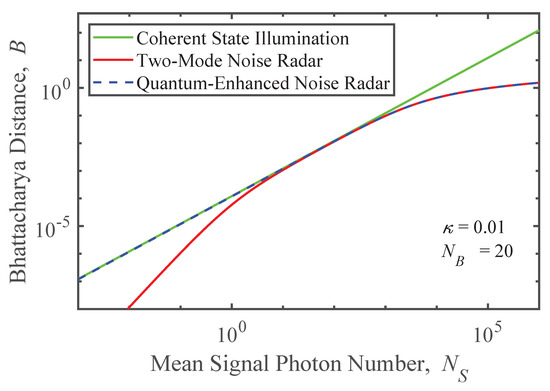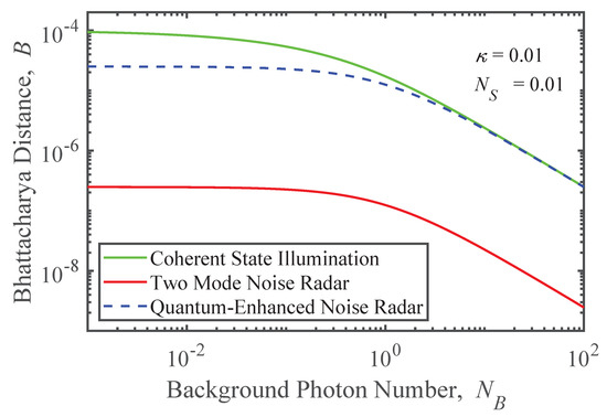 Further insight can be gained from varying the parameters in Equations (22), (24) and (26) beyond the regime of validity of Equation (23). Figure 4 shows the Bhattacharya distances for coherent state illumination (green), two-mode noise radar (red), and quantum-enhanced noise radar (blue dashed) as functions of the mean background noise photon number, , when and . When , all distances decline monotonically as the background noise increasingly dominates the signal field. The distance for quantum-enhanced noise radar closely approaches that of coherent state illumination, while the advantage over two-mode radar is a fixed multiplicative factor. At the other extreme, when , all three curves flatten as the background becomes effectively a vacuum state.