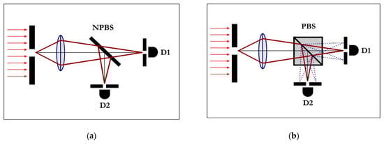 Spatial filtering of polarization components in optical arrangements. Input modes of polarization can suffer differential phase-shifts during propagation through birefringent media. If the axis of polarization of a component is neither parallel to the fast axis nor to the slow axis of a polarizing beam-splitter, it will suffer a phase shift relative to the rest of the projection. As a result, a single spatial mode at the input can be transformed into a projection with several spatial modes at the output, if it is not polarized. These modes can be resolved in the focal plane of a lens, in which case input polarization information is converted into output spatial information. (a) Optical modes are not perturbed by ideal non-polarizing beam-splitters (NPBS), such as half-silvered mirrors. Component states of polarization cannot be spatially resolved. (b) A single optical mode is transformed into multiple optical modes after passing through a polarizing beam-splitter (PBS). Individual modes can be isolated in the focal plane with a pinhole (or, even better, with the tip of a single-mode optical fiber). The input state of polarization is erased by the birefringent medium, but the relative magnitude of the corresponding spatial mode can be measured and used for post-processing.