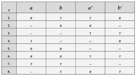 In order to interpret complex phenomena such as the delayed choice entanglement swapping, it helps to start with the basic underlying properties of Bell measurements. The most typical method for validating the presence of quantum entanglement is by testing for violations of Bell-type inequalities, such as the Clauser-Horne-Shimony-Holt (CHSH) inequality [33]. For example, a pair of beams with entangled photons can be aimed at two detectors (Alice and Bob), each of them with a choice between two observables (a or a′ and b or b′). In the case of polarization-entangled photons, the highest violations are expected when the angle between the measured linear states of polarization is 22.5° [34,35,36]. Accordingly, if a corresponds to 0°, then b must correspond to 22.5°, while a′ and b′ may correspond to 45° and 67.5°, respectively. To test for violations of the CHSH inequality, four joint measurements need to be performed, in order to determine four coefficients of quantum correlation (CQ). Quantum entanglement is verified when the following inequality is violated: