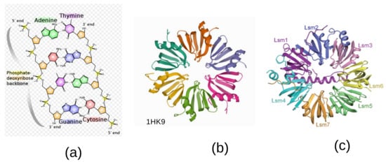 (a) Five-fold symmetry in the DNA, (b) six-fold symmetry in the LSM protein complex Hfq [], (c) seven-fold symmetry of the Lsm1-7 complex in the spliceosome [].