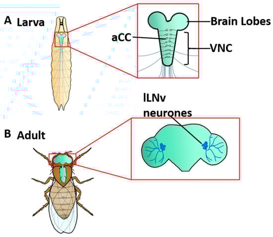 Diagrammatic representation of larval and adult Drosophila. (A) Representation of a Drosophila larva, with central nervous system (CNS) shown in blue. The expanded region shows the CNS with the approximate location of the segmentally repeated anterior corner cell (aCC) motoneuron along the dorsal midline of the ventral nerve cord (VNC). (B) Representation of adult Drosophila with CNS shown in blue. Expanded region shows the central brain region with approximate location of lLNv clock neurons.