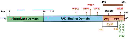 Representation of the key regions, motifs and residues in Drosophila CRY. Respective positions of structural elements/motifs are shown by amino acid number (#aa). Key regions include N-terminal Photolyase Domain (1-170aa), FAD-Binding Domain (171-512aa), and the C-terminus (CT) (493-541aa), which encompasses the important regulatory region of the C-terminus tail (CTT) (510-542aa). Tryptophan (W) residues implicated to support the canonical radical pair mechanism (RPM) are shown in red (although W536 is a residue of interest, it is yet to be investigated). Calmodulin-binding (CaM) (491-518aa) and PDZ (528-531 and 538-541) domains are present in the CTT. These are of particular interest as nucleation points for the recruitment of interactors and downstream signalling partners.
