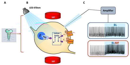 - Giachello, C.N.G.; Scrutton, N.S.; Jones, A.R.; Baines, R.A. Magnetic Fields Modulate Blue-Light-Dependent Regulation of Neuronal Firing by Cryptochrome. J. Neurosci. 2016, 36, 10742–10749. [Google Scholar] [CrossRef] [PubMed]
