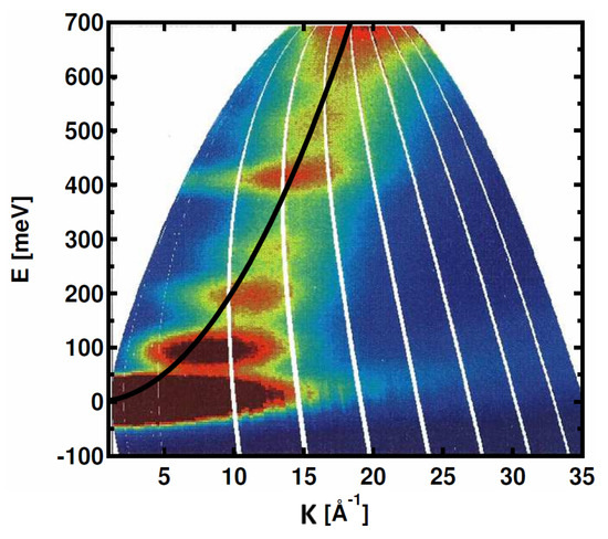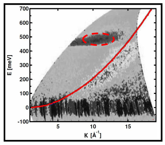 Schematic representation (blue points) of the dynamic structure factor of liquid helium, adapted from Ref. [18]. The experiment was performed with the 2-dimensional TOF-spectrometer ARCS [19]. Red line: The calculated recoil parabola, Equation (10), for the mass of He. The data are fitted with the recoil parabola with a.m.u. excellently. (Figure taken from Ref. [11] with permission of Quanta).